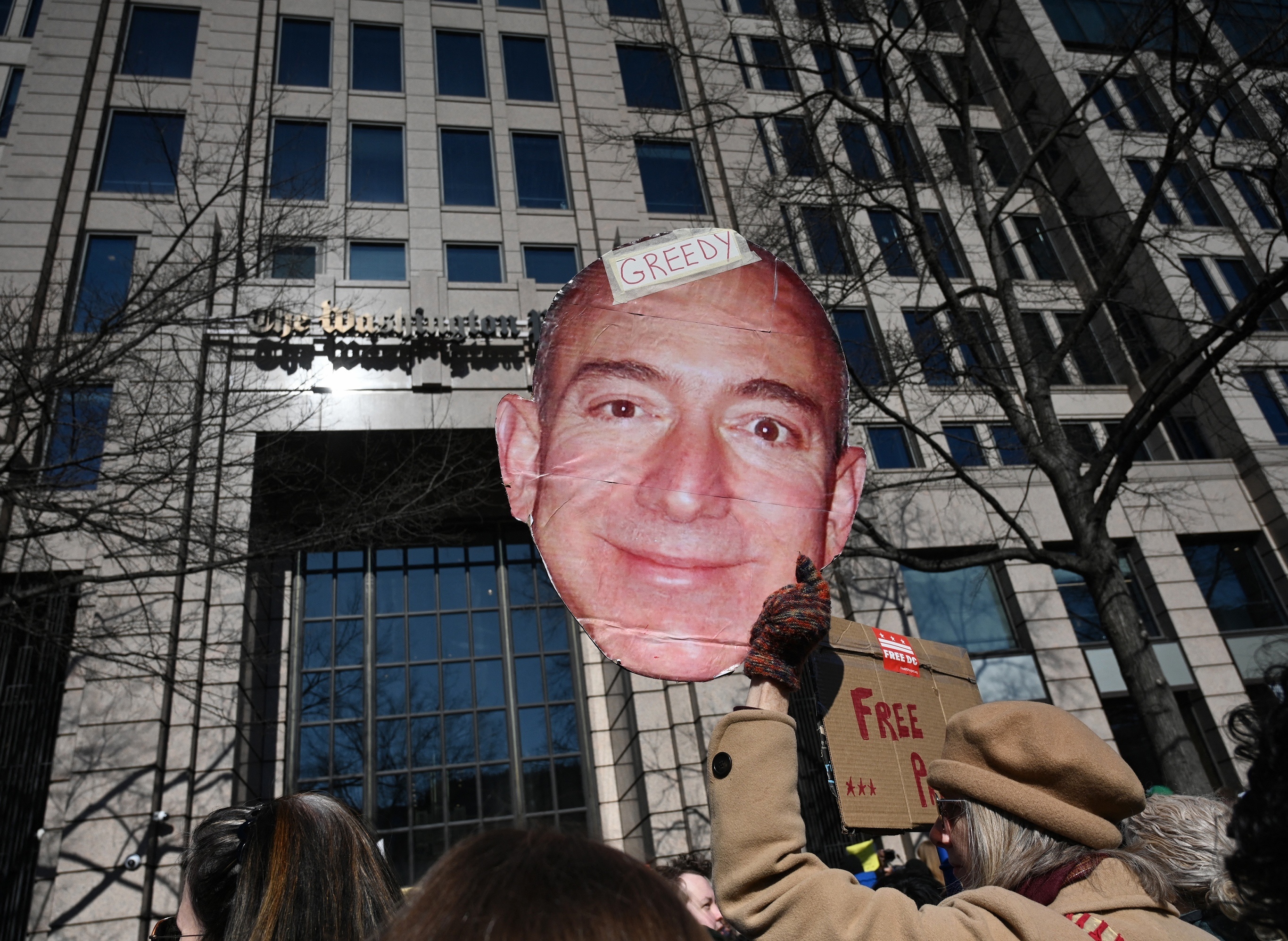 《华盛顿邮报》员工和工会成员在报社大楼外集会抗议,华盛顿特区。2月4日,美国亿万富翁 Jeff Bezos 收购的《华盛顿邮报》报社宣布启动大规模裁员计划,该报约800名记者中将有近300人被解雇,主要涉及国际新闻、地方新闻、体育版以及书籍副刊等栏目,其中包括整个驻中东报道团队和驻基辅记者。《华盛顿邮报》创刊于1877年,是美国最具影响力的报刊之一,曾于1972年揭露「水门事件」,官方标语为「民主在黑暗中死亡」(Democracy Dies in Darkness)。摄影师:Olivier Douliery