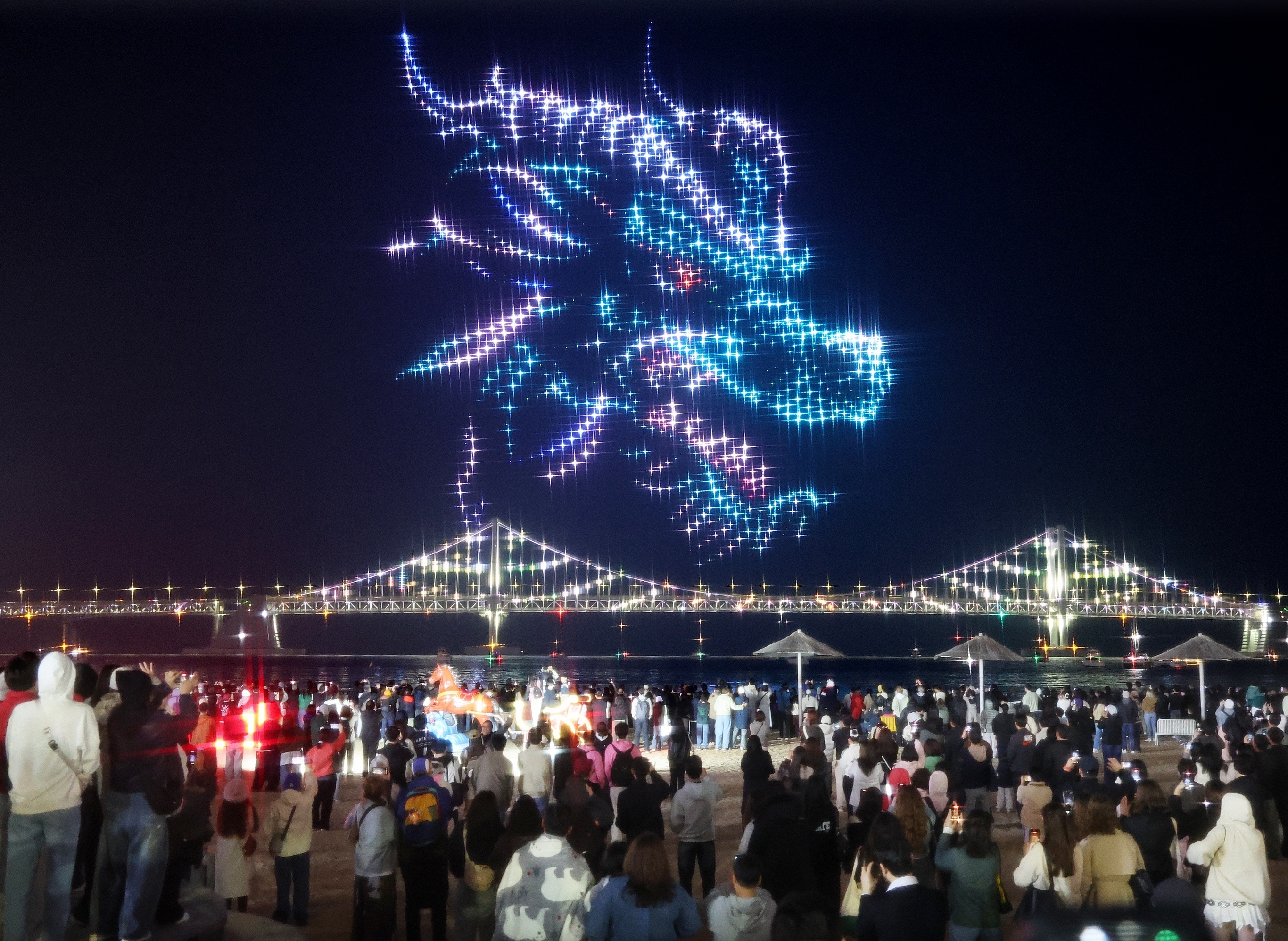 韩国釜山广安里海滩举行无人机灯光表演秀。3月28日,韩国釜山广安里海滩举办新一轮「广安里M无人机灯光秀」,共有1000架无人机参与表演。这是韩国首个无人机常设秀,亦是规模最大的无人机灯光秀,每周六晚举办2场演出,每场演出持续约12分钟。釜山市政府公布数据显示2025年接待外国游客同比增长24.4%至364万人次,创历史新高,主要受到各类大型活动及美食、邮轮观光体验项目推动,该市目标至2028年吸引500万外国游客。摄影师:iDaily Media