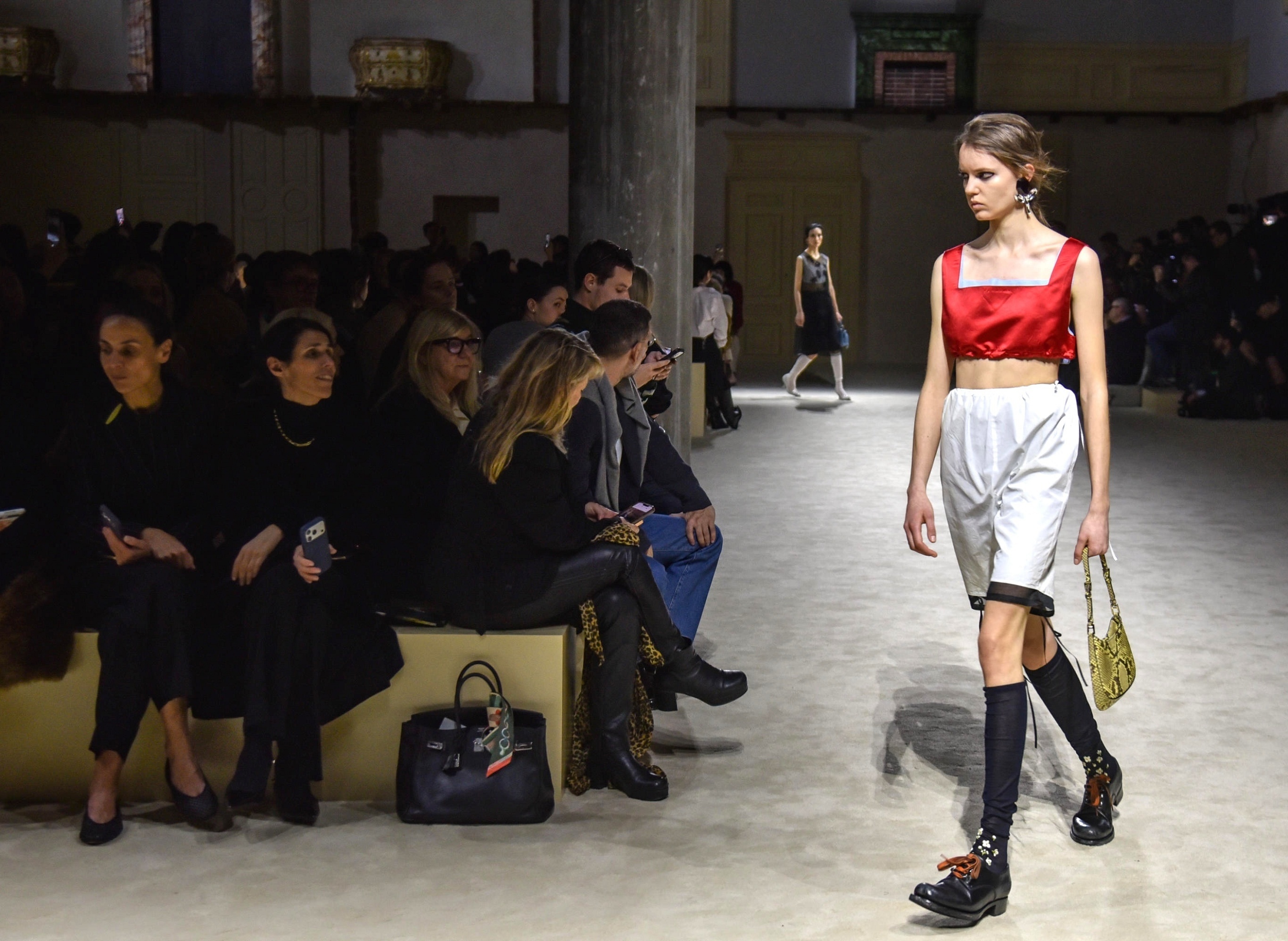 米兰 2026 秋冬时装周 Fendi 秀场,模特们正在展示品牌新任创意总监 Maria Grazia Chiuri 的首季时装作品。本季时装作品以「舍我之见,成众之美」(Less I, More Us)为主题,设计师以极简黑白色调搭配中性廓形,模糊衣橱的性别界限,致敬意式优雅风范和女性力量,薄纱连衣裙、皮草马夹等波西米亚风格单品诠释都市中的「游牧精神」。回收利用的皮草服饰经由拆解和裁缝技艺被重构为披肩、衣领、拼接外套等单品,焕新传统皮草工艺并传递永续时尚理念。摄影师:iDaily Media