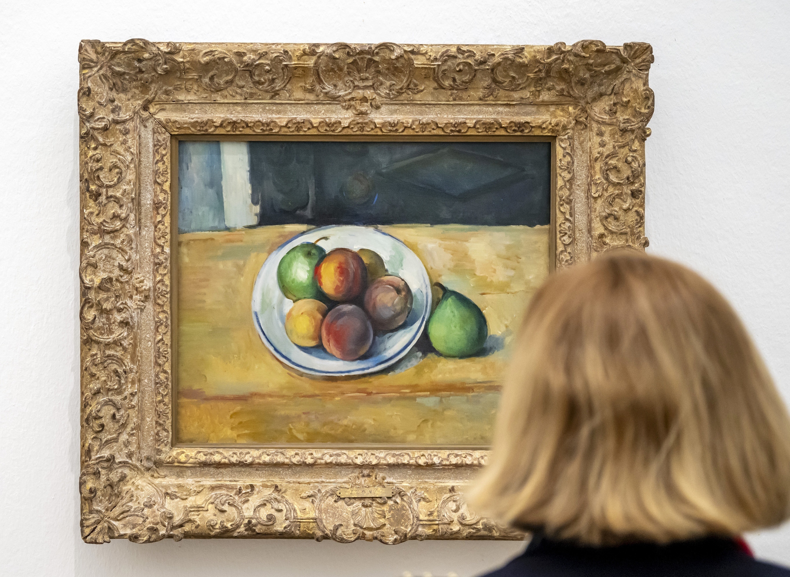 瑞士贝耶勒基金会举办「保罗·塞尚」专题展,一幅法国印象派画家 Paul Cezanne 1887年油画《静物:桃子和梨》正在展出,里恩。1月25日,贝耶勒基金会首次举办保罗·塞尚的大型专题展览,共汇集约58幅油画和21幅水彩画作品,涵盖静物、肖像、风景和沐浴场景等题材,其中包括标志性的沐浴者系列和圣维克多山系列。本次展览聚焦塞尚职业生涯晚期的绘画风格,展现这位艺术家在构图、光影和色彩描绘上的开创性成就与影响,展期持续至5月25日。摄影师:Georgios Kefalas