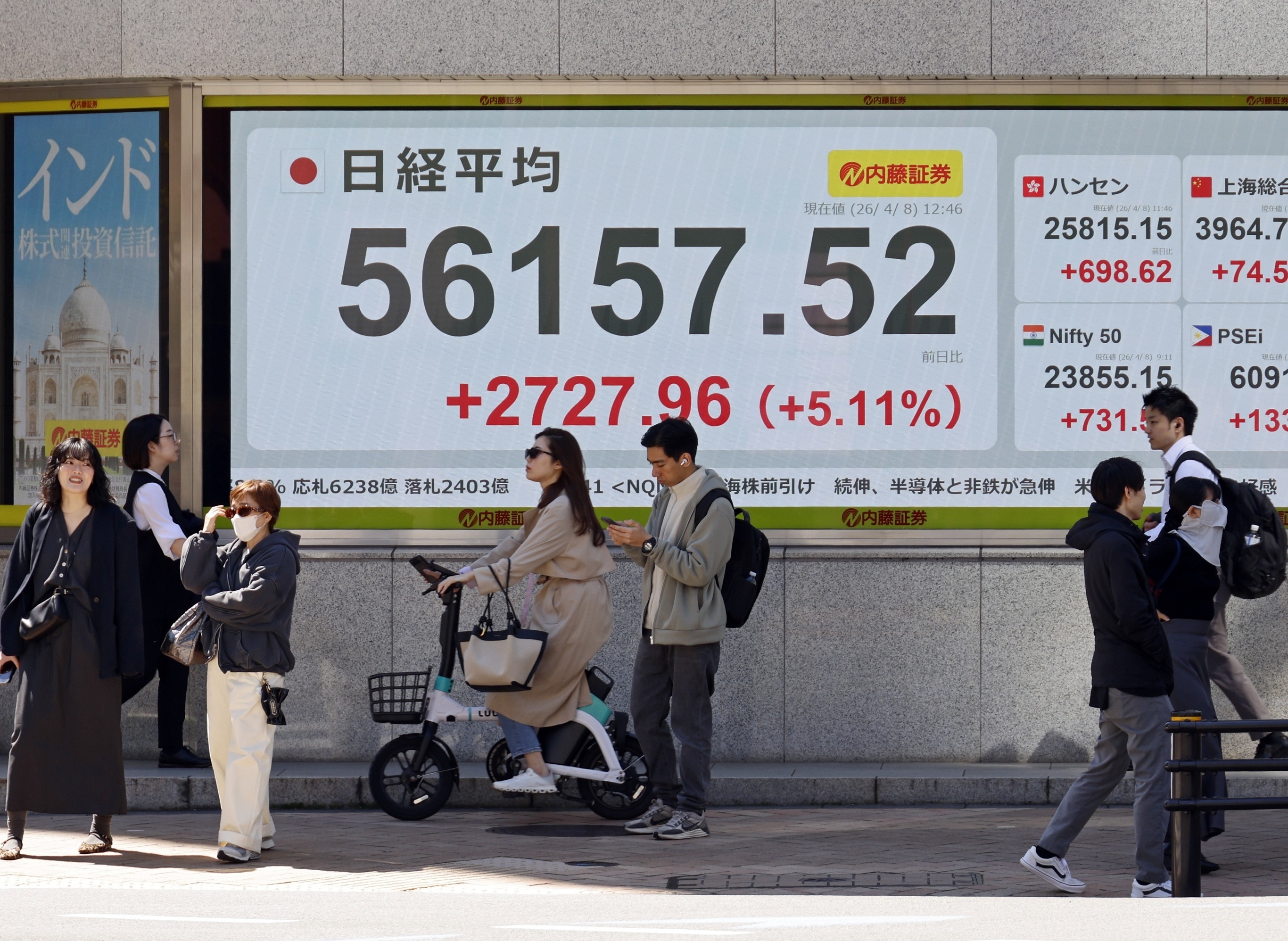 东京证券交易所屏幕上显示日经平均指数即时数据,日本。4月8日,受美伊达成停火协议消息影响,日经平均指数收盘大涨2878.86点至56308.42点,单日上涨5.39%,创下史上第三大收盘涨幅;东京证券交易所主板市场近90%股票收盘上涨。美元兑日元汇率涨至158.2。日本10年期国债收益率下行4个基点至2.365%。全球基准布伦特原油期货价格下跌约-15.9%至每桶92.30美元。摄影师:Franck Robichon