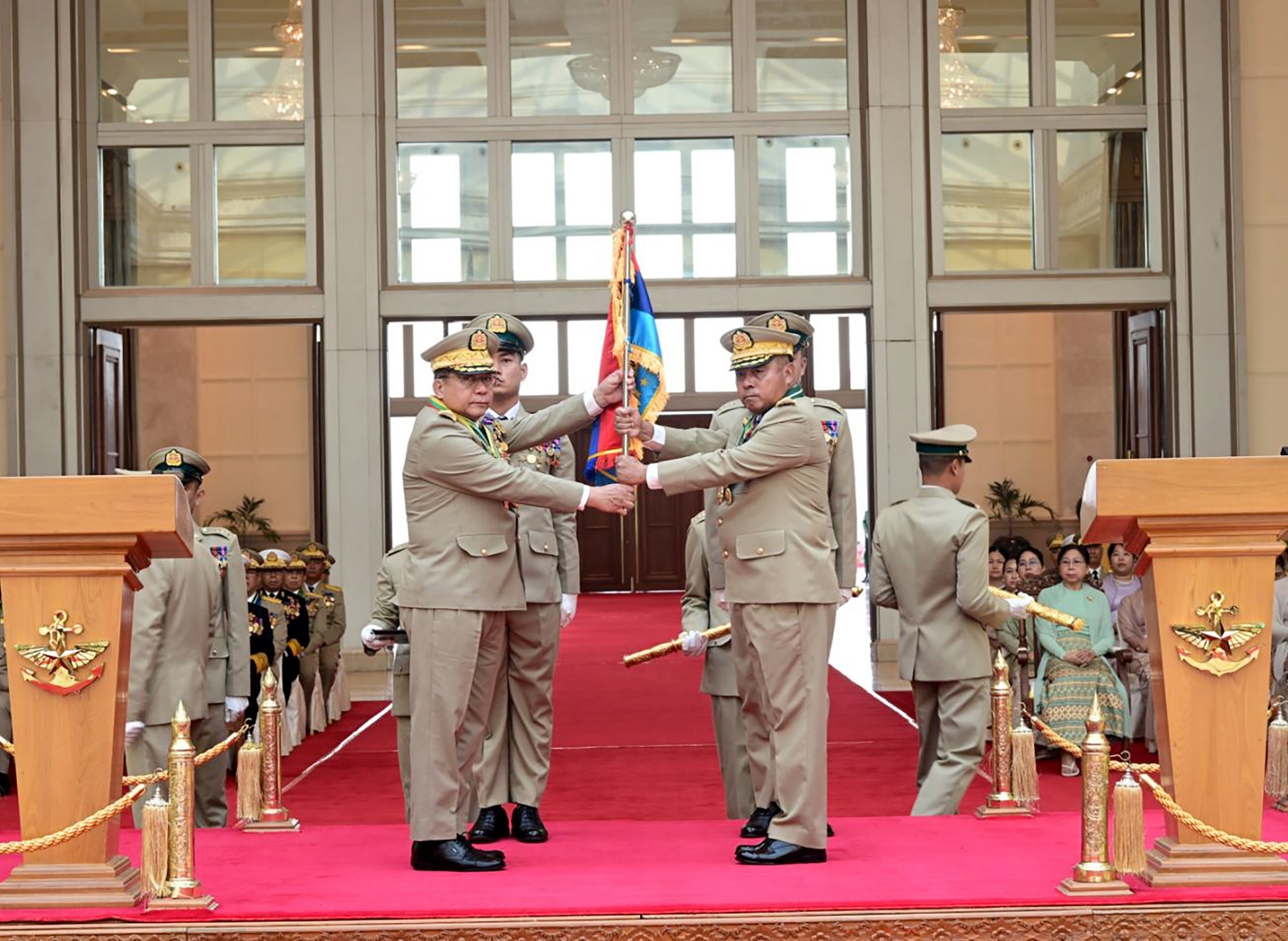缅甸军方代表和议员出席联邦议会会议,内比都。4月3日,缅甸联邦议会举行总统选举投票,军方提名候选人、前军政府领导人敏昂莱赢得584票中的429票,以压倒性优势当选第4任缅甸总统。现年69岁的敏昂莱自2011年开始担任缅甸国防军总司令,2021年发动政变推翻昂山素季政府并成为缅甸实际领导人,本次选举意味着他正式从政变领袖转型为民选总统。敏昂莱预计于下周正式宣誓就职总统,任期5年,可连任一届。摄影师:Aung Shine Oo