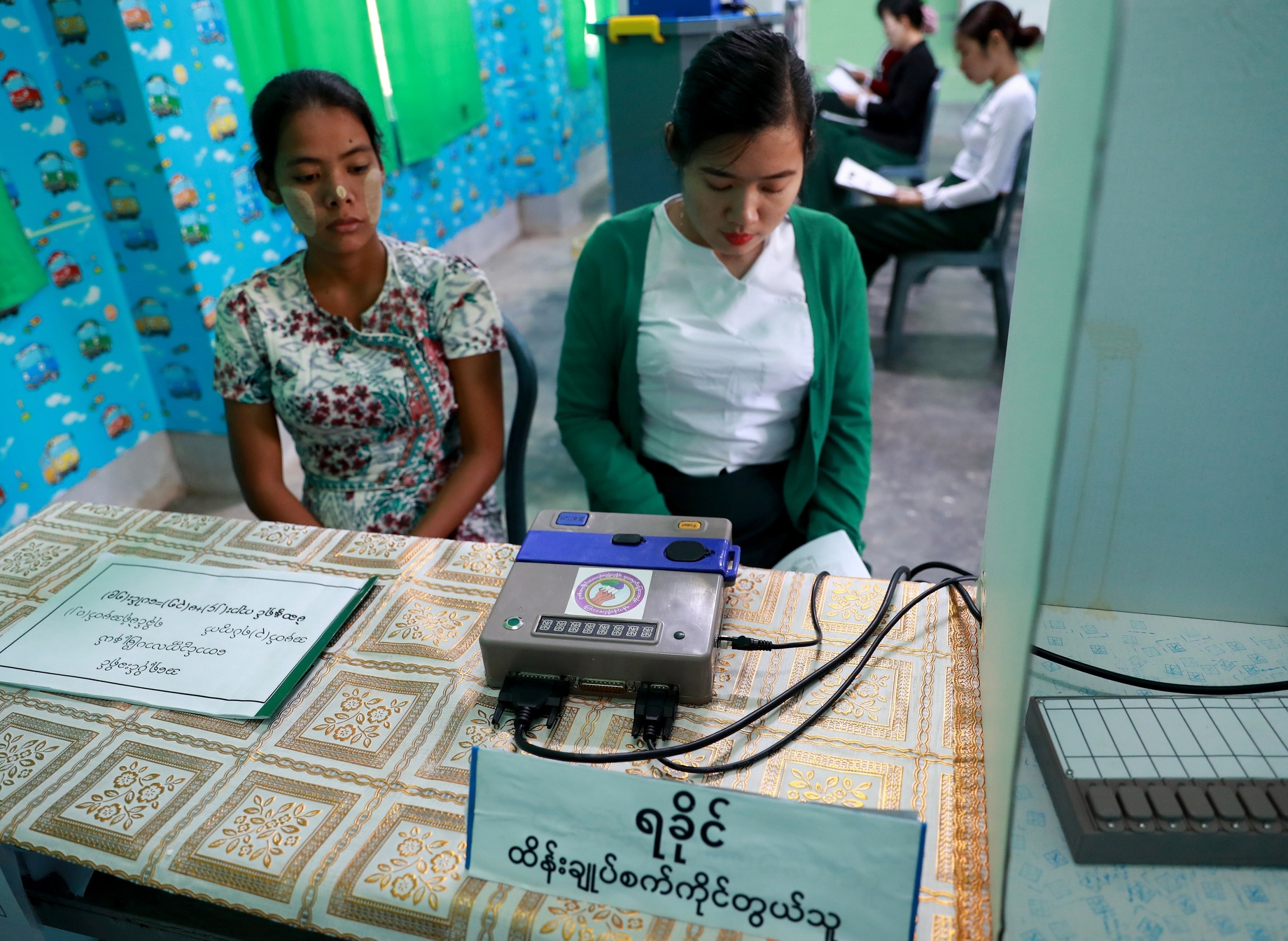 缅甸选举委员会工作人员正在安装第二阶段投票使用的电子投票机,仰光。1月11日,缅甸全国大选第二阶段投票在全国100个乡镇启动,投票时间从上午6时开始持续至下午4时结束。缅甸本届大选共有来自57个政党逾4800名候选人参加,第一阶段投票结果显示军方支持的缅甸第一大政党「联邦巩固与发展党」取得压倒性胜利,赢得联邦议会89%下议院席位、68%上议院席位以及80%地方议会席位。摄影师:Nyein Chan Naing