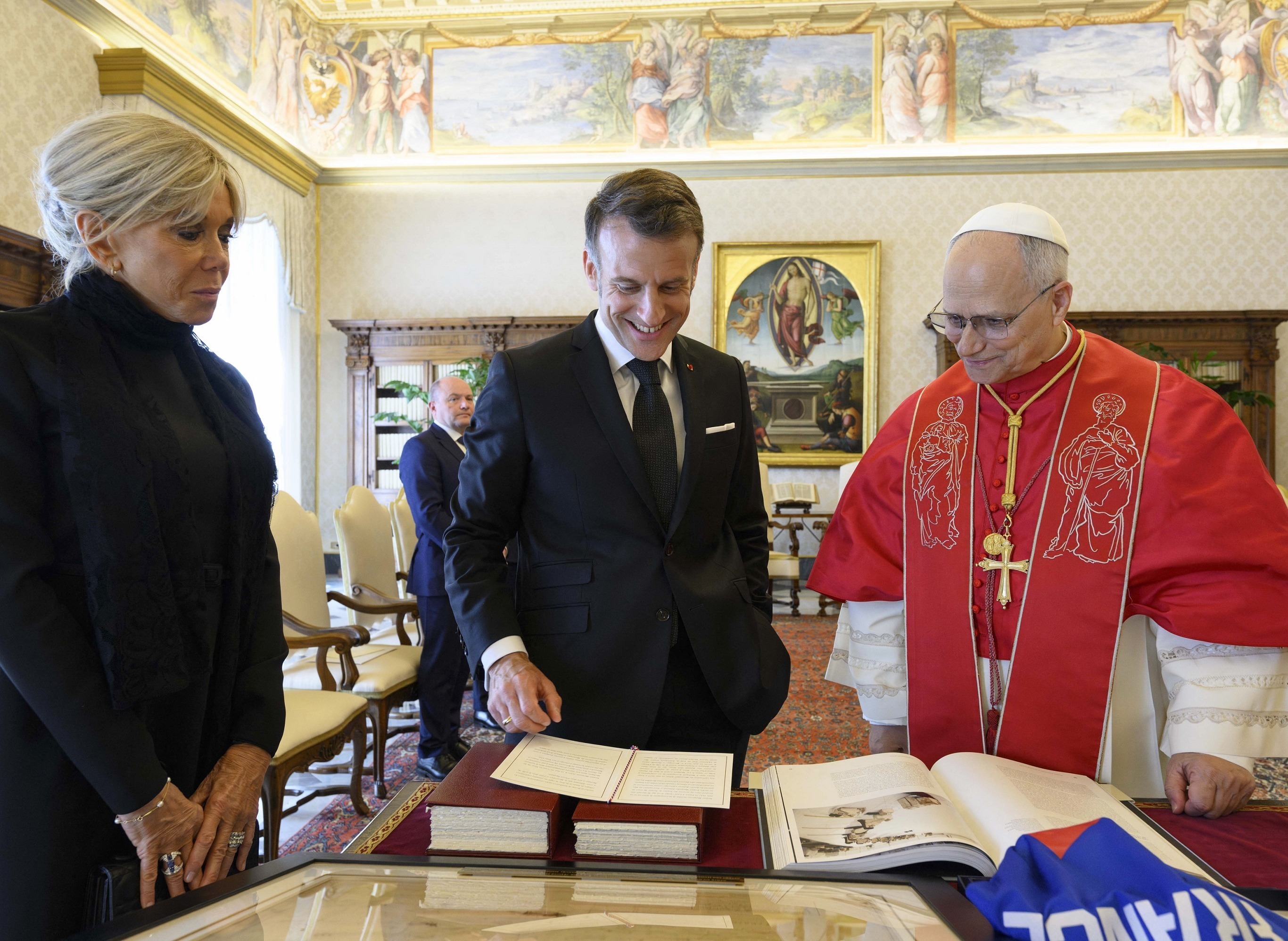 罗马教宗良十四世接见法国总统 Emmanuel Macron,梵蒂冈。4月10日,教宗良十四世与法国总统 Macron 在梵蒂冈举行首次会晤,双方在约2个小时会面中重点讨论了中东冲突、多边主义、气候变化、人道主义紧急形势等议题。法国总统向教宗赠送一件法国国家篮球队的签名球衣和一本关于巴黎圣母院火灾后重建的书籍作为礼物;教宗回赠一块象征富饶的装饰花砖和一份世界和平日文告。教宗当天再次公开谴责「毫无意义且非人道的暴力」,并警告「基督徒不能与那些投下炸弹的人站在一起」。摄影师:Vatican Media
