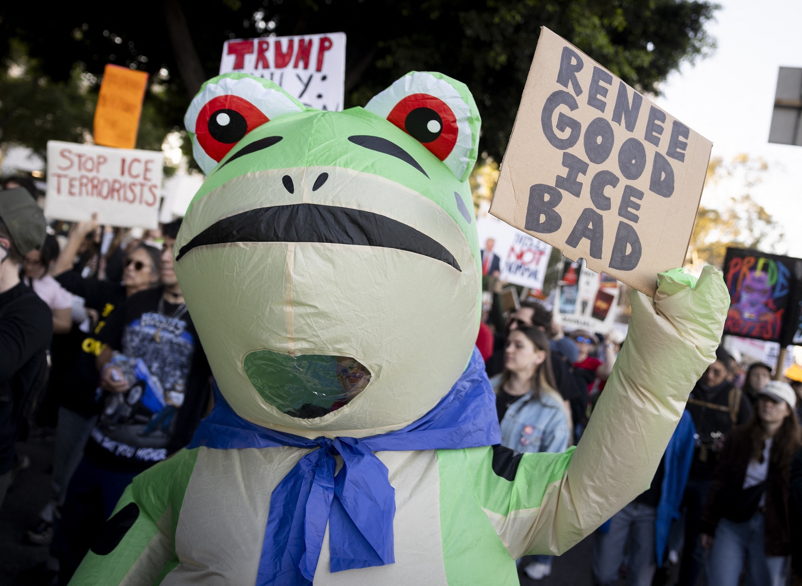 洛杉矶民众游行抗议美国移民与海关执法局(ICE)暴力执法。1月10日,美国纽约、费城、波士顿、洛杉矶等数十座主要城市爆发超过1000场示威游行,抗议美国政府的大规模驱逐移民政策。本轮抗议的导火索是美国移民与海关执法局警员于1月7日在明尼阿波利斯市开枪打死一名37岁美国白人女性公民 Renee Nicole Good。美国国土安全部称该女子「试图开车撞向执法人员」,坚称警员开枪是出于「正当防卫」。摄影师:Etienne Laurent