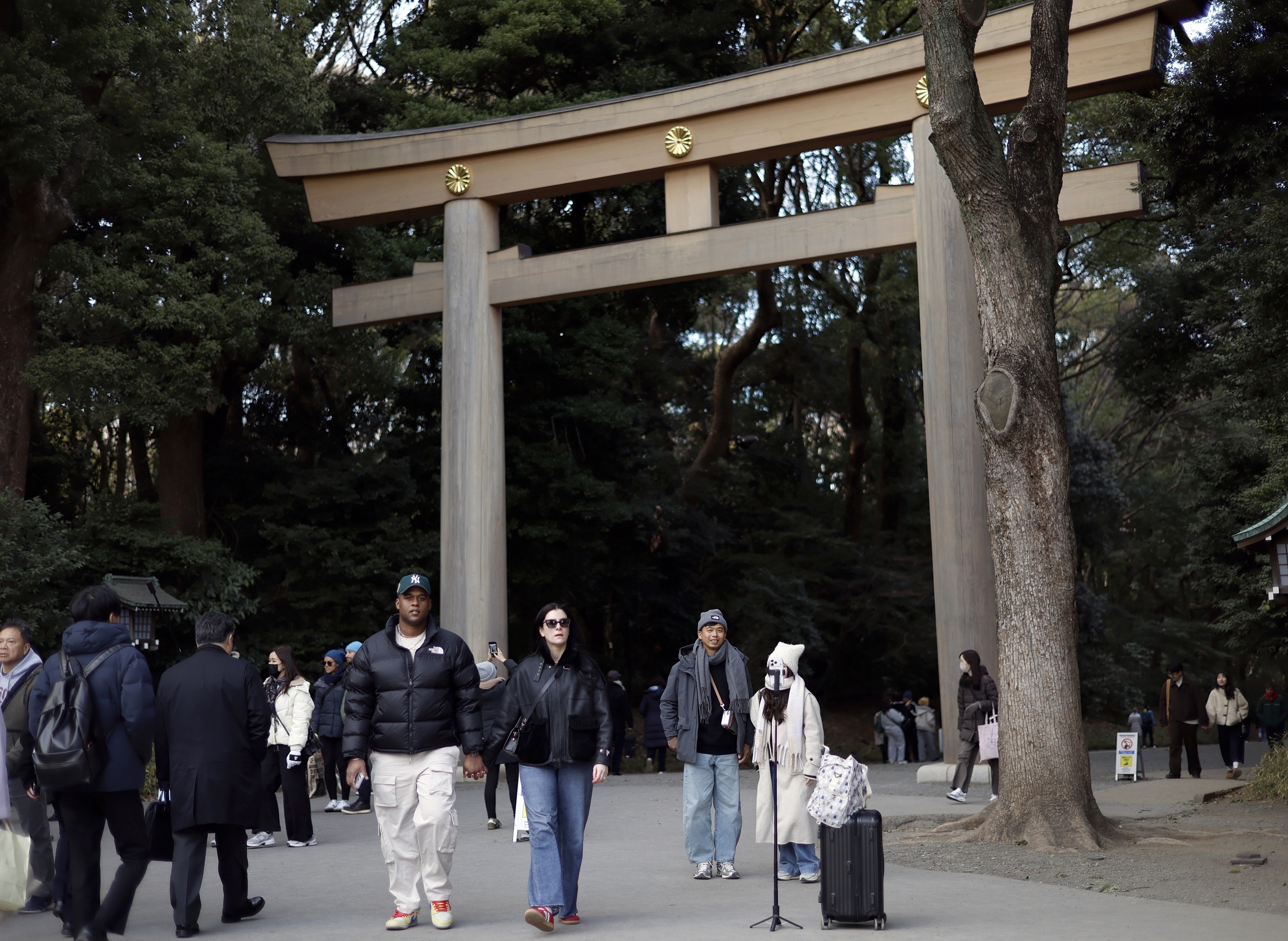 游客们参观明治神宫,东京。1月21日,日本观光厅公布2025年访日外国游客人数达到4268万人次,同比增长15.8%,外国游客在日消费额达9.5万亿日元(约合598亿美元),同比增长16.4%,均创历史新高,排名前三的游客来源地依次为韩国、中国大陆和中国台湾。受日本首相高市早苗涉台言论影响,2025年12月赴日中国游客人数同比减少-45%,为近4年来首次下降。日本旅游发展局预测中国游客减少将导致2026年日本入境游客总数下降-3%。摄影师:Franck Robichon