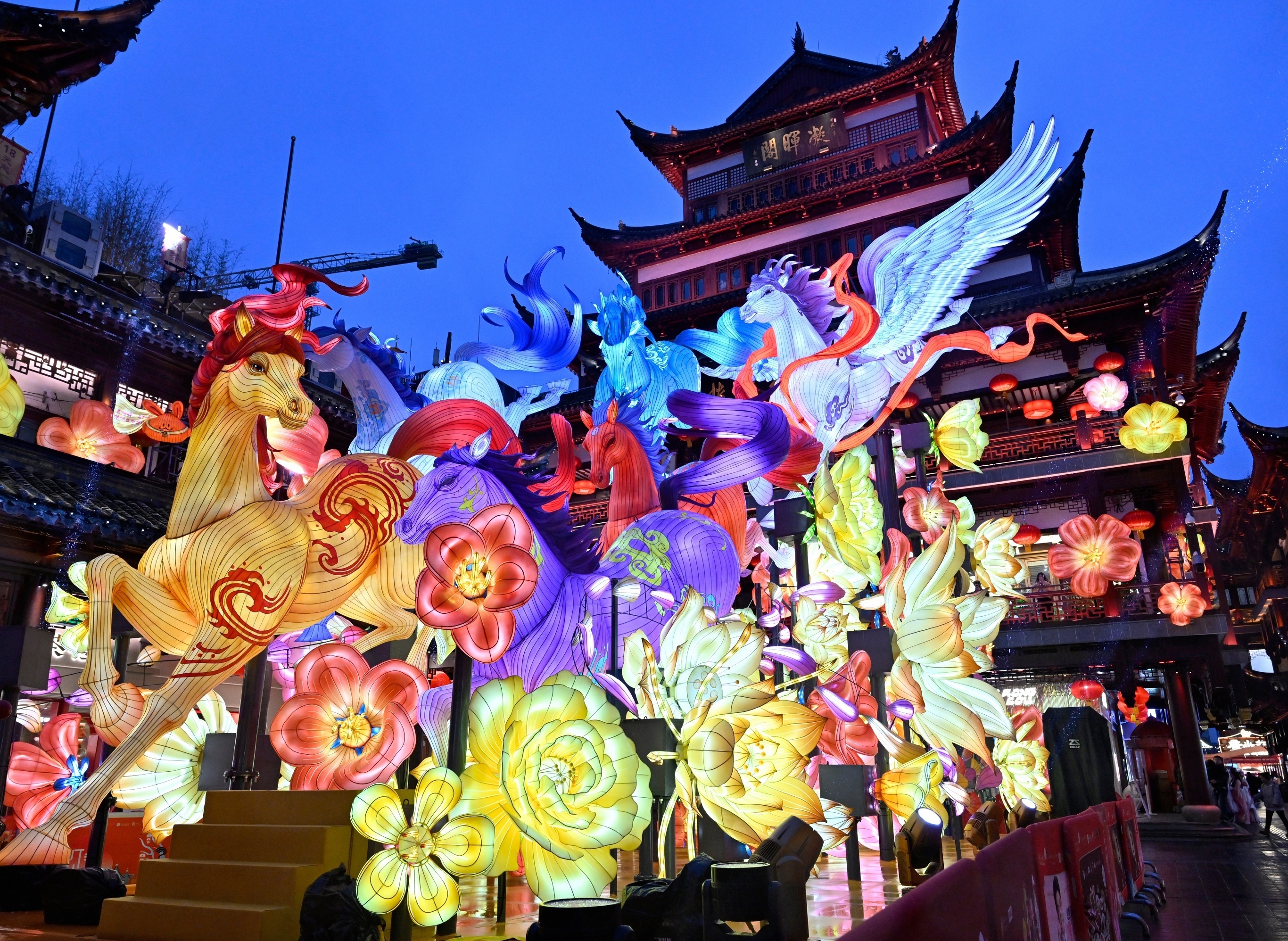 上海城隍庙豫园展出农历马年主题彩灯迎接春节。1月26日,上海豫园2026马年灯会正式亮灯,本年度主灯命名为「骏驰九州,步步生花」,灵感来自唐太宗昭陵六骏石刻,每一匹马均融入洛阳博物馆馆藏文物的标志性元素,展期持续至3月3日。上海市文旅局公布数据显示,2025年上海全市共接待入境游客936.02万人次,同比增长39.58%,创下历史新高,前五大游客来源地依次为韩国、日本、美国、泰国和马来西亚。摄影师:iDaily Media