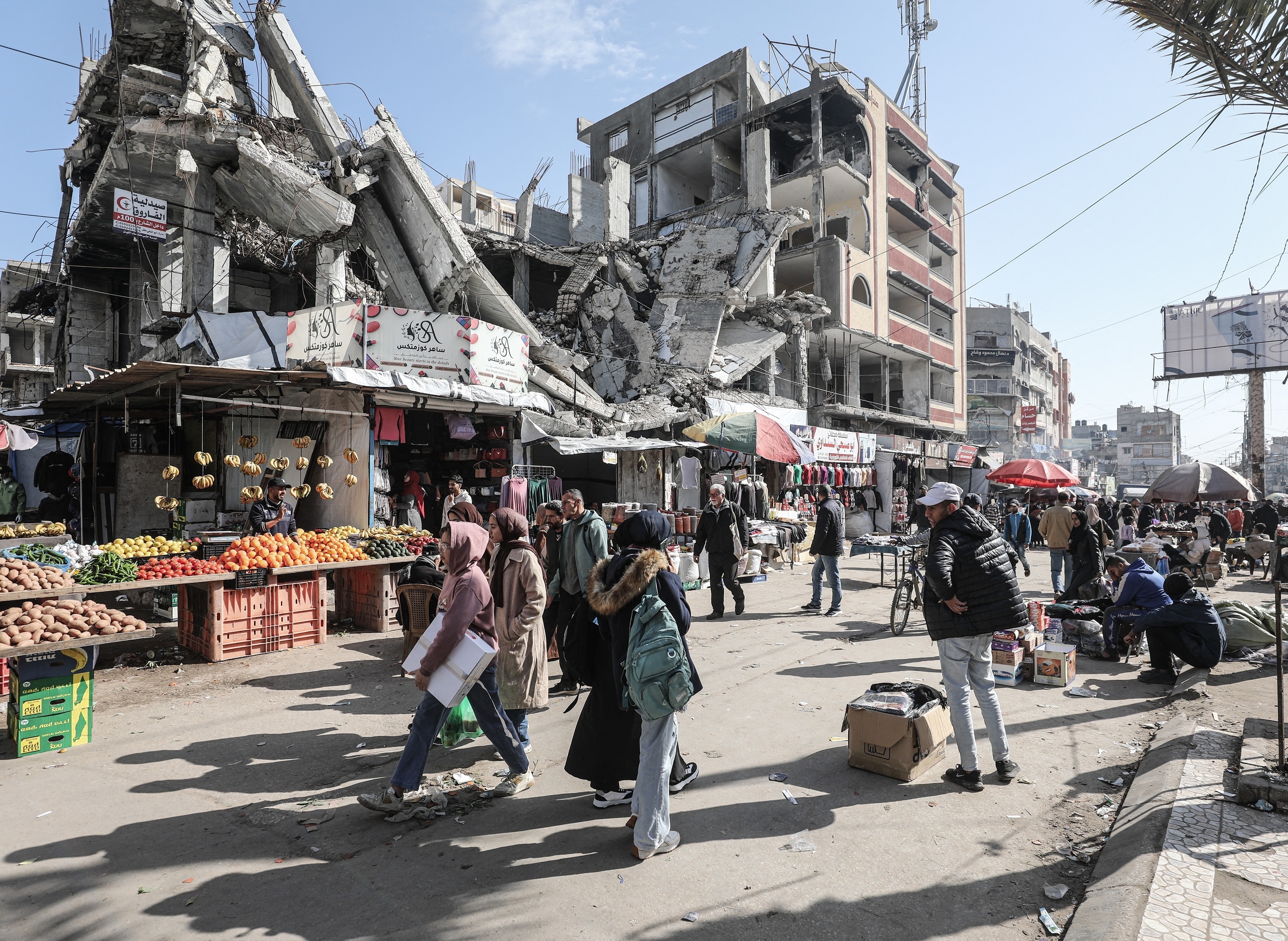加沙地带民众在努塞拉特难民营的市集里购买必需品。1月21日,联合国人道主义事务协调厅通告加沙地带已经报告第9起低温致死事件,呼吁以色列允许向加沙地带运送电池、太阳能板等用于搭建供暖场所的能源设备。联合国秘书长副发言人表示2026年迄今已有逾86万人通过50个分发点领取食品包,人道主义组织每天向加沙提供约160万份热餐。加沙和平方案第二阶段于1月中旬正式启动,主要内容包括在加沙地带展开非军事化、技术官僚治理和重建工作。摄影师:Moiz Salhi