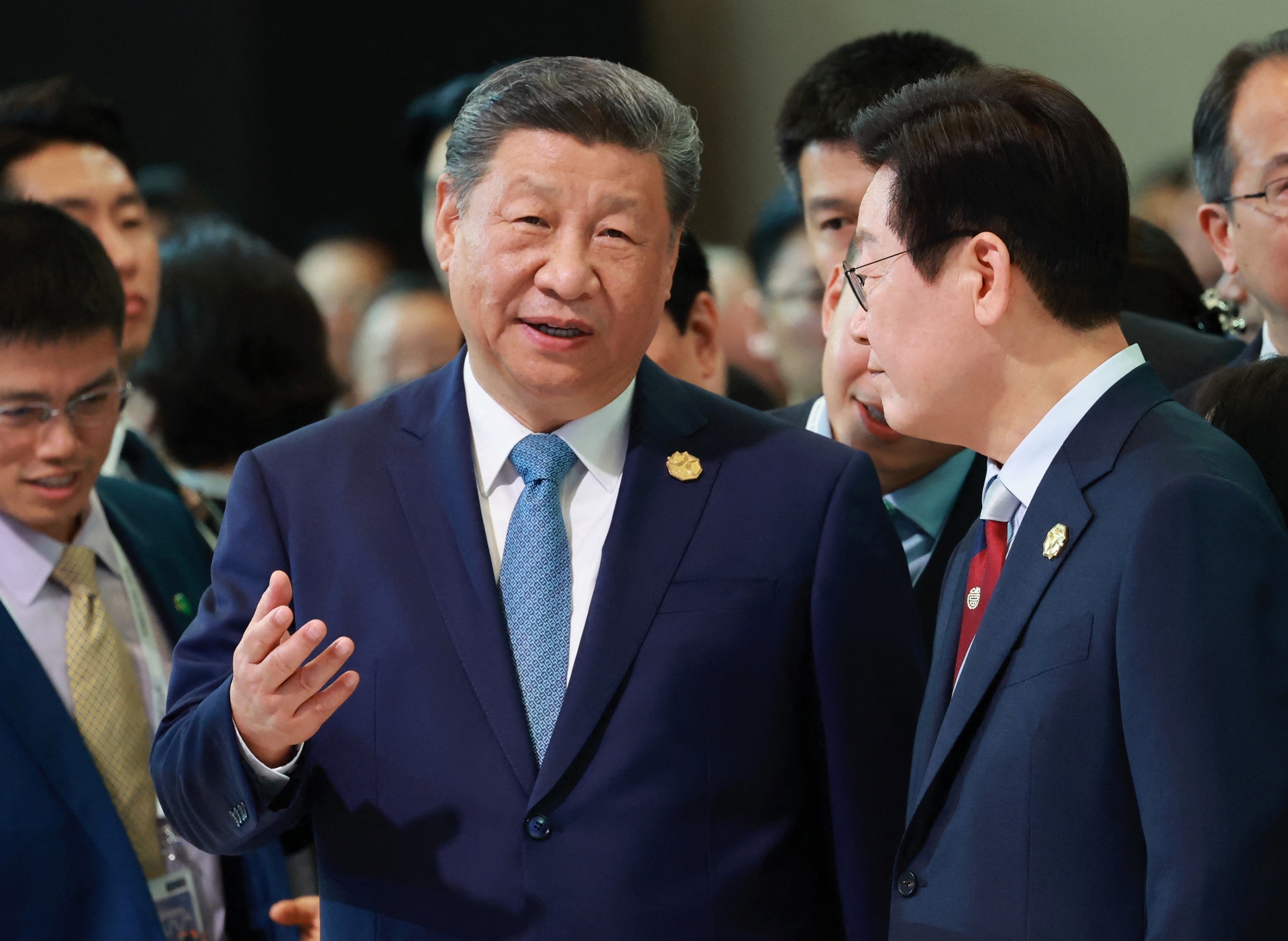 中国国家主席习近平与韩国总统李在明在亚太经合组织(APEC)领导人晚宴上交流,庆州。10月31日,第32次 APEC 领导人非正式会议在韩国庆州举行。中国国家主席习近平在讲话中针对亚太地区发展提出5点建议,分别为共同维护多边贸易体制、共同营造开放型区域经济环境、共同维护产业链供应链稳定畅通、共同推进贸易数字化绿色化以及共同促进普惠包容发展。习近平强调中国始终坚持对外开放的基本国策,中方愿同各方一道,坚持创新、协调、绿色、开放、共享的发展理念,携手构建亚太共同体。摄影师:iDaily Media