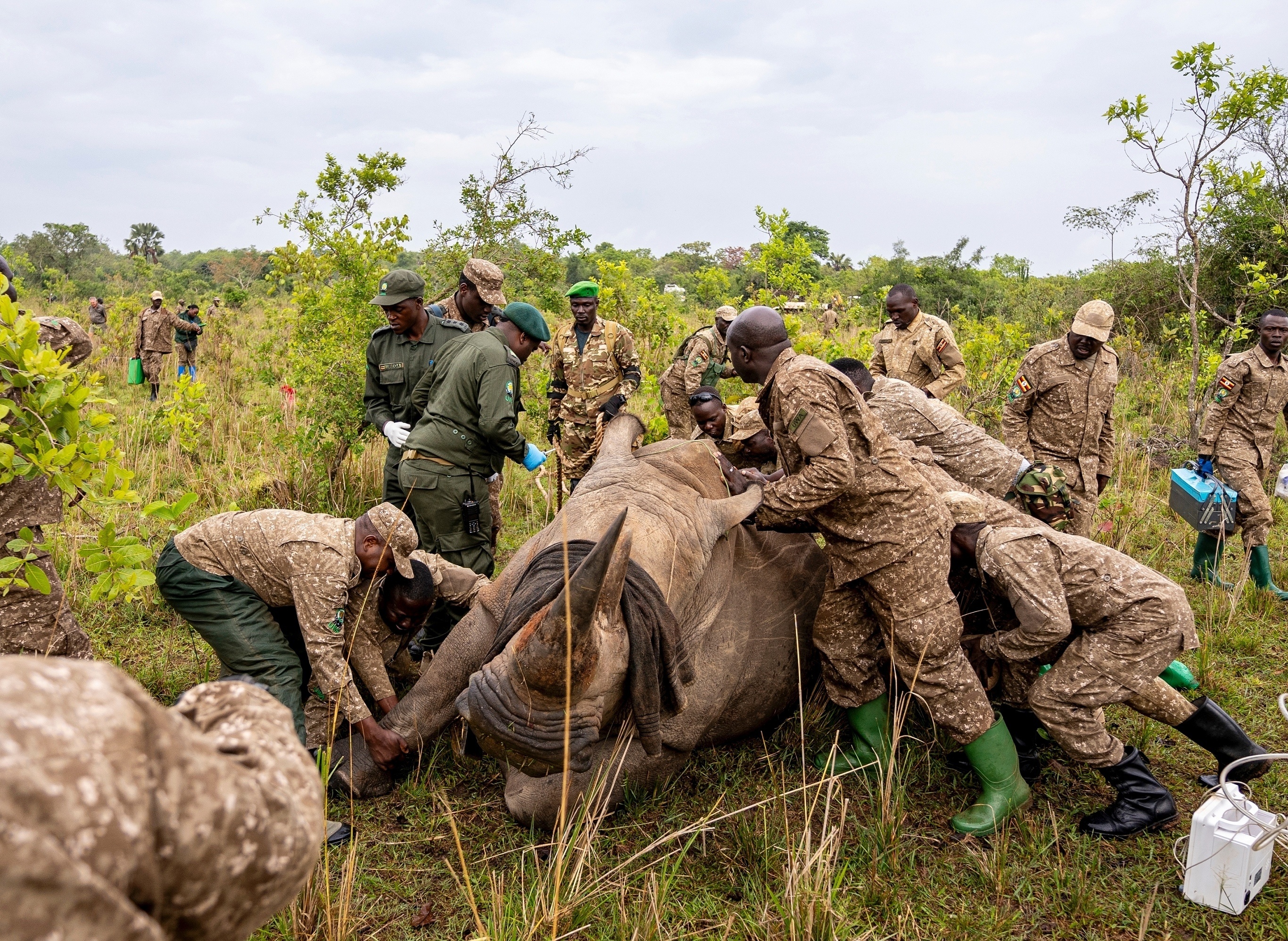乌干达野生动物管理局(UWA)工作人员正在转移一只被注射镇静剂的南方白犀牛,纳卡松戈拉区。3月19日,乌干达野生动物管理局将来自私人保护区的2只南方白犀牛转运至基代波谷国家公园,标志着该国家公园时隔40年首次重建犀牛种群。乌干达野生动物管理局计划分批向基代波谷国家公园引入8只南方白犀牛,以促进当地犀牛种群的恢复繁衍。白犀牛是现存体型最大的犀牛物种,北白犀仅存2只雌性个体,南白犀数量约1.8万只,被列为近危物种。摄影师:Moses Dipak