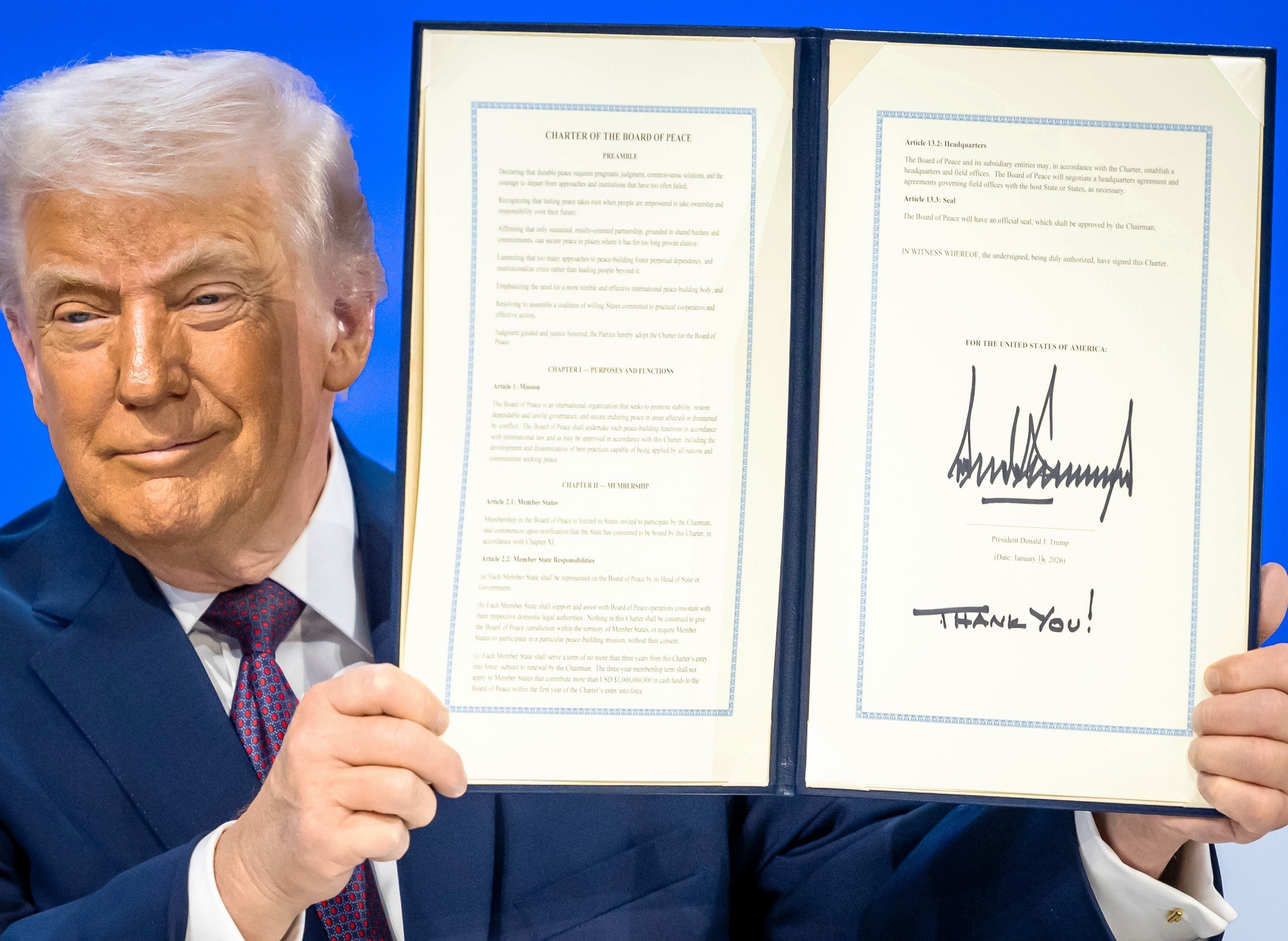 美国总统 Donald Trump 签署「和平委员会」(Board of Peace)创始章程,瑞士达沃斯。1月22日,美国总统 Trump 在达沃斯举行「和平委员会」签约启动仪式,美国、沙特、印尼、卡塔尔、阿联酋、阿根廷、匈牙利等共20个国家的领导人现场签署启动文件。「和平委员会」创始章程宣布该组织致力于在冲突地区促进稳定、法治以及确保持久和平,成员国任期不超过3年,但第一年捐款超过10亿美元者可豁免此限;「和平委员会」主席有权罢免成员国,所有决议需经主席批准,美国现任总统 Donald Trump 担任首任主席,主席有权指定继任者并决定是否卸任。摄影师:Fabrice Coffrini