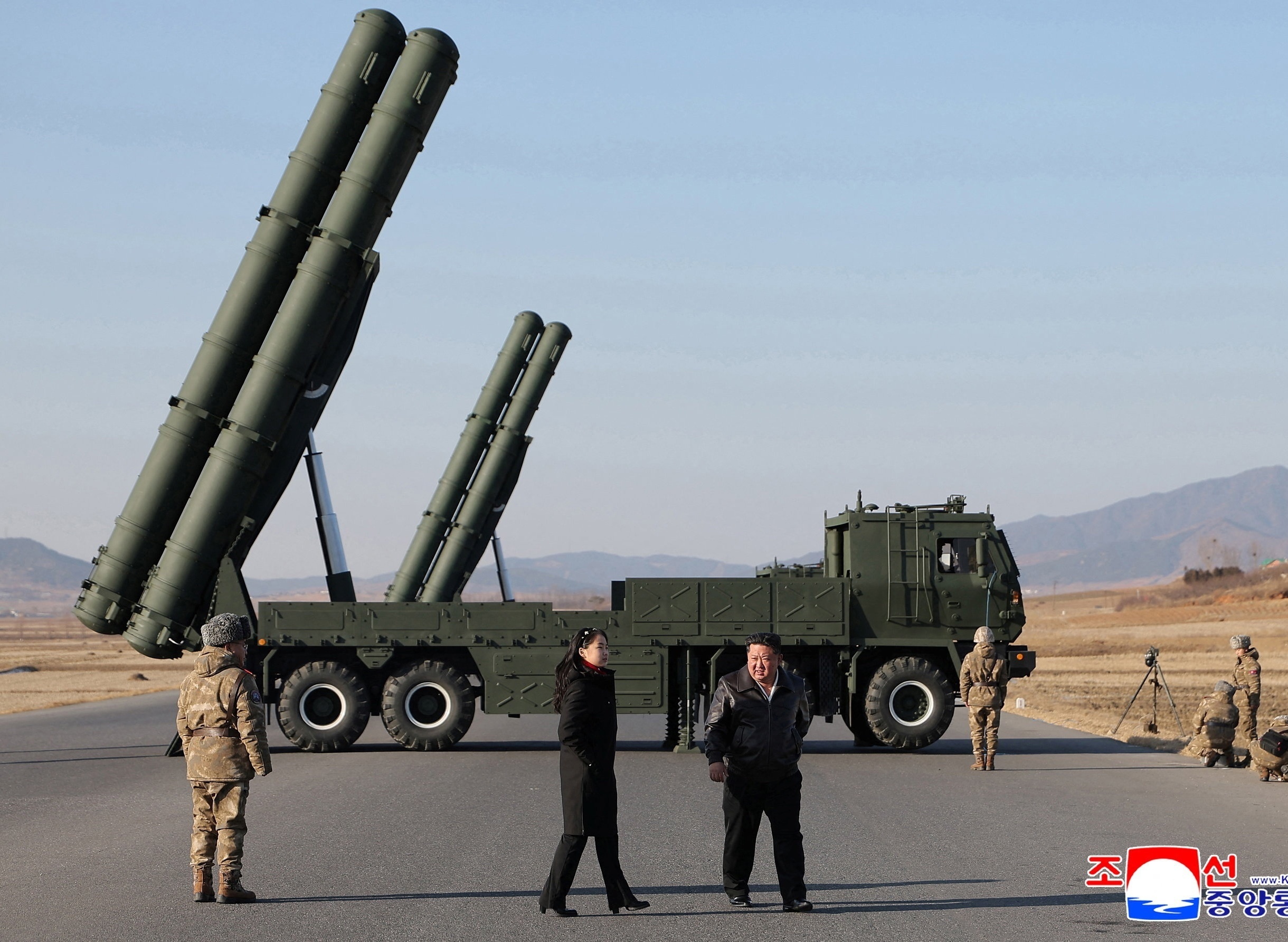 朝鲜最高领导人金正恩携女儿观摩大口径火箭炮武器系统试射。1月28日,朝中社报道称朝鲜导弹总局成功实施升级版大口径火箭炮武器系统的试射工作,4枚火箭炮全部击中358.5公里外的海上目标。朝鲜领导人金正恩现场观摩试射并表示满意,他强调「基于强大攻击能力实施战争遏制战略」是朝鲜坚定不移的国家防卫政策,宣布将在劳动党第九次代表大会上阐明提升核战遏制力的下一阶段构想。这是朝鲜2026年度第二次发射制导武器,距离上次高超音速导弹发射训练相隔23天。摄影师:KCNA
