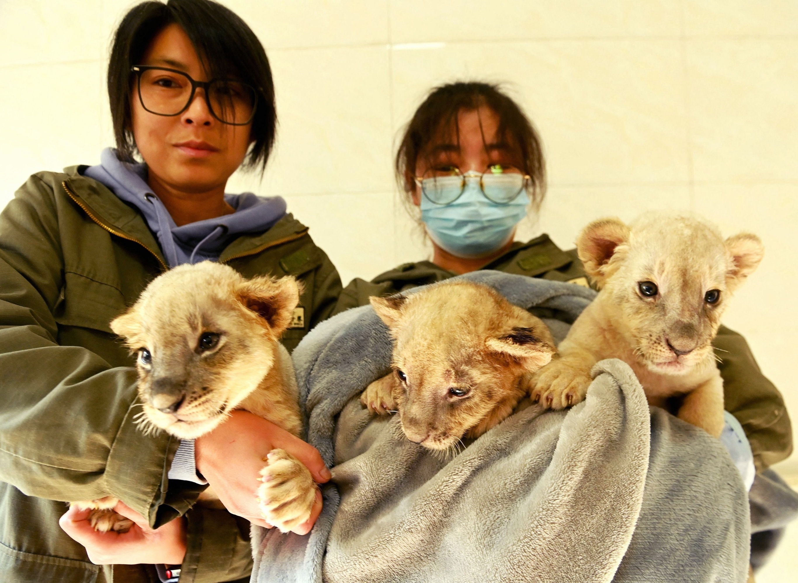 青岛森林野生动物世界,新生三胞胎小狮子首次公开亮相,中国山东省。10月28日,青岛森林野生动物世界的新生三胞胎小狮子迎来满月。这3只小狮子为1只雄性和2只雌性,体重均达到2.5千克,目前由保育员24小时看护,平均每4小时喂奶一次,预计2026年初正式与游客见面。摄影师:iDaily Media