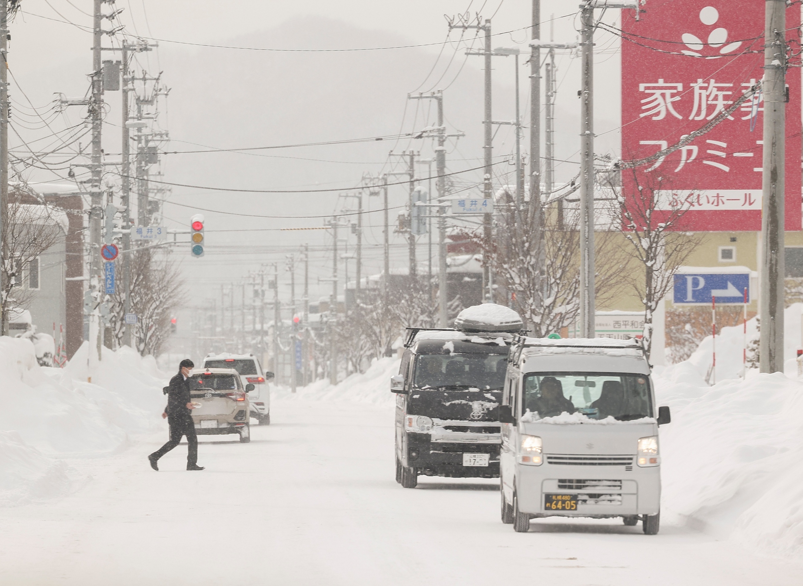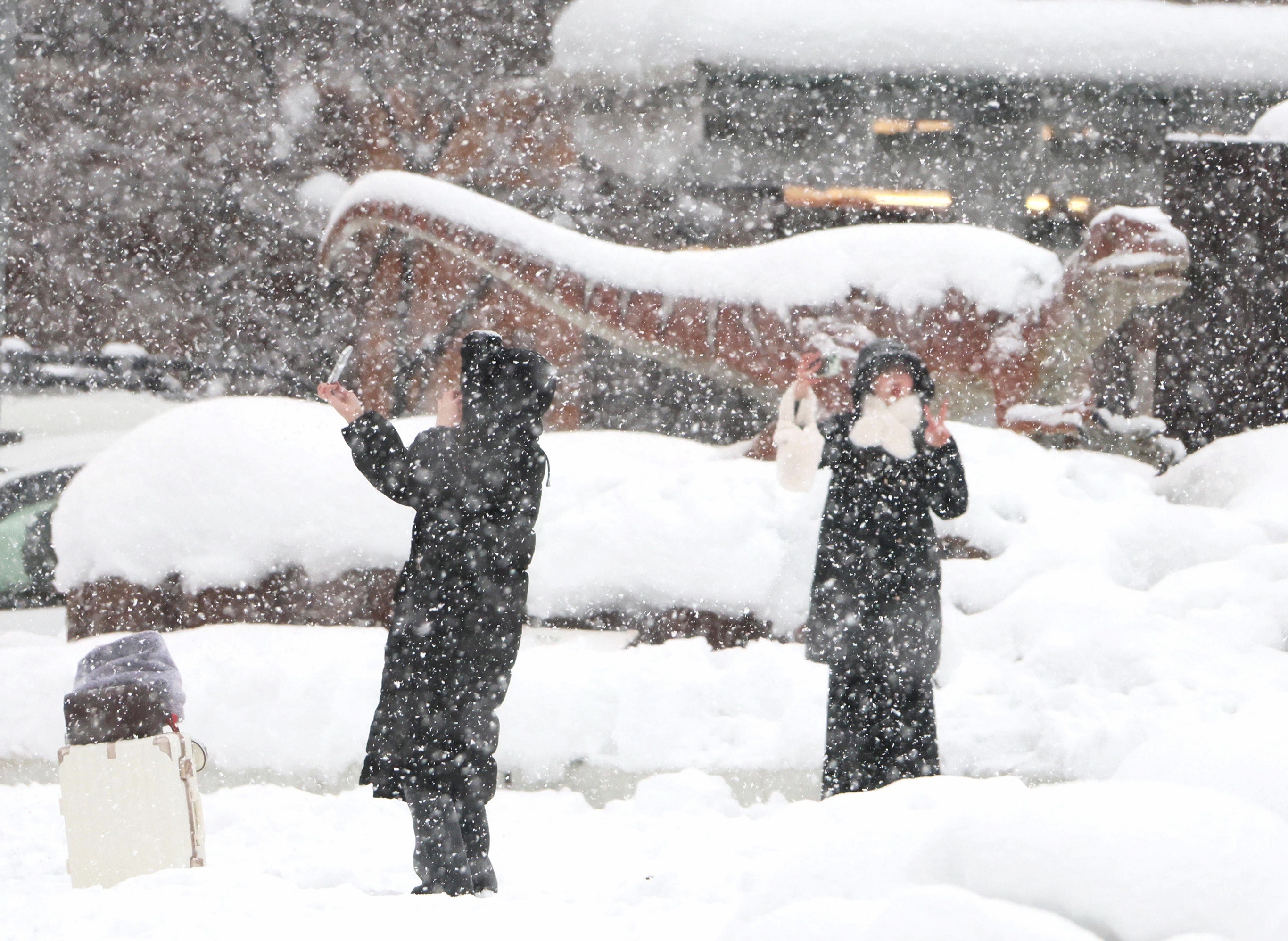 日本福井市民在街头拍摄雪景。1月25日,日本持续遭受本轮入冬最强寒潮影响,部分地区降雪量达到年平均水平3倍以上,石川县金泽市6小时内录得降雪量37厘米,创下1997年有统计数据以来最高降雪纪录,新潟县鱼沼市最大积雪深度达到264厘米。日本总务省消防厅统计1月20日以来的强降雪天气已在各地造成4人死亡和26人受伤,预计降雪将在1月26日继续影响日本北陆、关东甲信等地。摄影师:Nanako Sudo