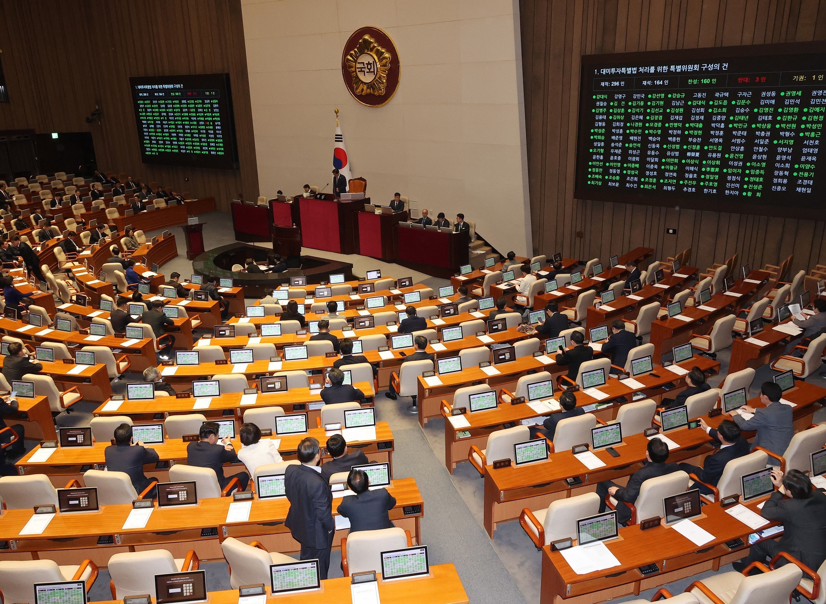 韩国国会表决通过成立《韩美战略投资管理特别法》推进委员会的决议,首尔。2月9日,韩国国会以160:3的投票结果批准成立专门审议《韩美战略投资管理特别法》的特别委员会,从而推进落实美韩贸易框架下的韩国对美国投资承诺。该委员会共有16名成员,其中8名来自执政党共同民主党,8名来自在野党派。根据美韩此前达成的协议,韩国承诺向美国投资3500亿美元,以换取美国对韩国的对等关税从25%降至15%。摄影师:iDaily Media