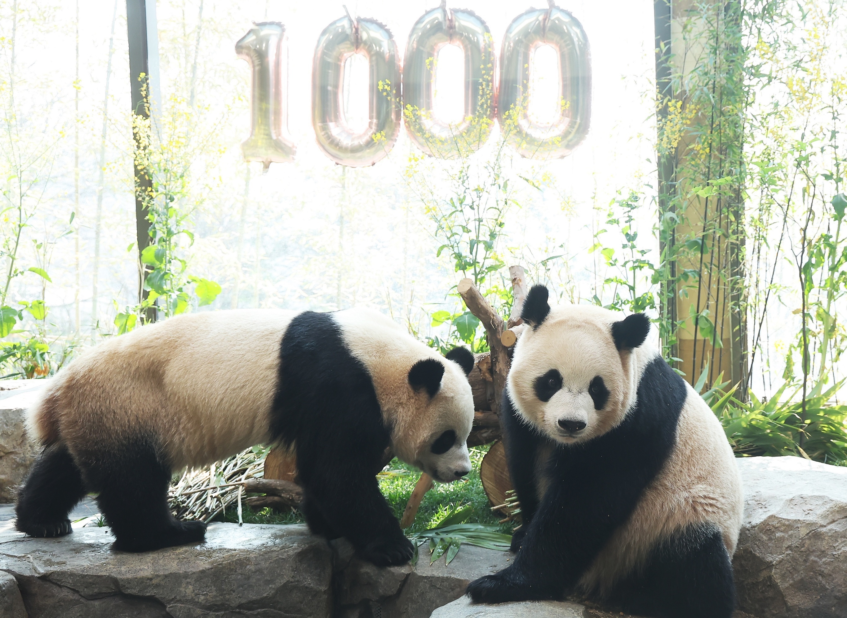 韩国龙仁市爱宝乐园,旅韩大熊猫双胞胎「睿宝」和「辉宝」迎来出生1000天。4月2日,韩国爱宝乐园为旅韩大熊猫双胞胎「睿宝」和「辉宝」准备了特制竹筒紫菜包饭以及木制摩托车玩具庆祝出生1000天。这两只大熊猫出生于2023年7月7日,是韩国境内诞生的第一对双胞胎大熊猫,父母分别为旅韩大熊猫「乐宝」和「爱宝」,目前体重均已超过80公斤,预计将于2027年满4岁时返回中国。摄影师:iDaily Media
