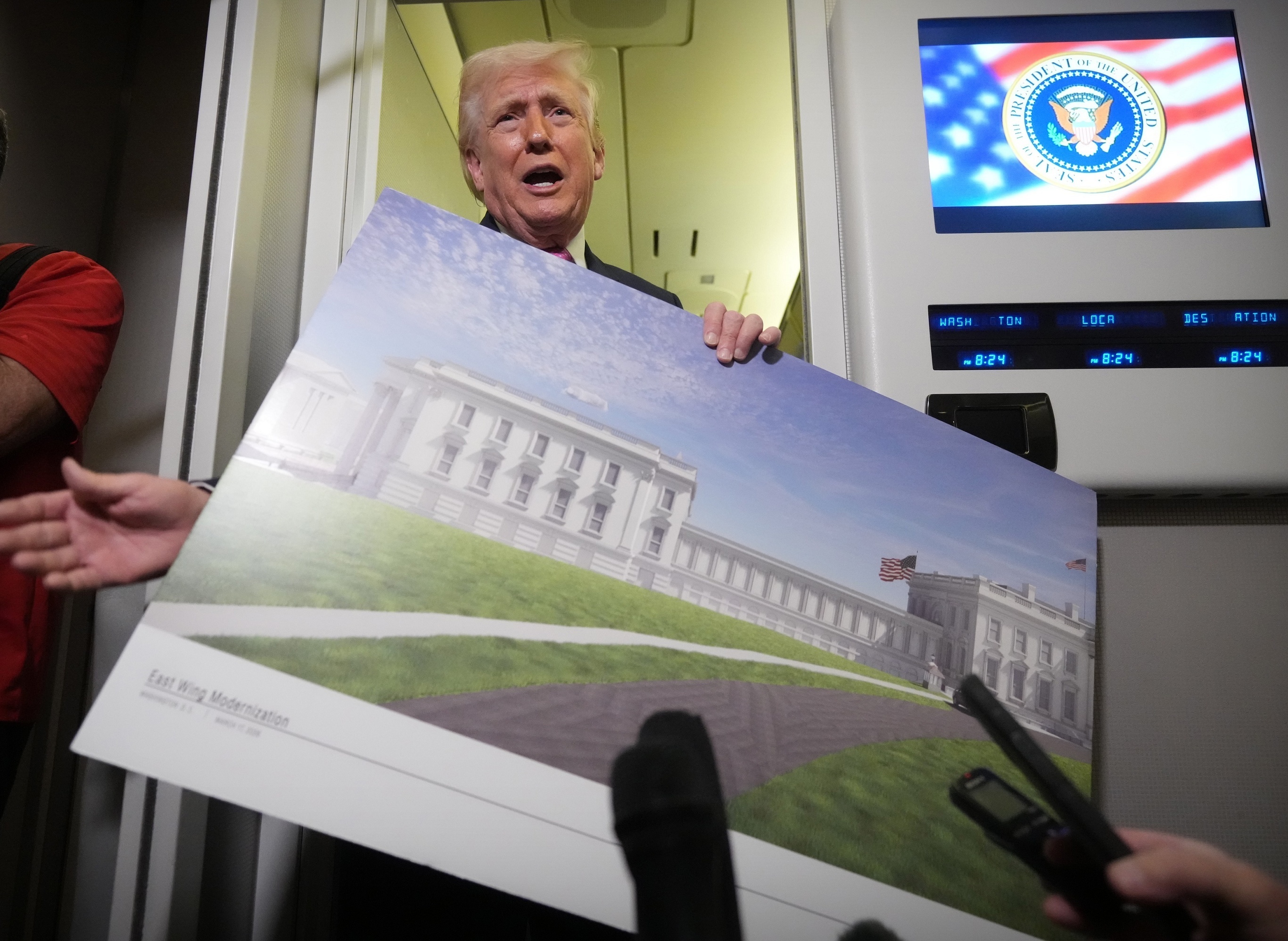 美国总统 Donald Trump 在「空军一号」上向记者展示一张白宫东翼宴会厅扩建项目效果图,佛罗里达州。3月29日,美国总统 Trump 向记者表示白宫宴会厅的建造工程「进度超前并控制在预算内」,他宣称这座新宴会厅是一座庞大地下军事掩体的上层建筑,宴会厅本身将配备高规格防弹玻璃窗和防无人机的屋顶。根据美国白宫公布计划,白宫东翼新宴会厅占地面积为8361平方米,可容纳约1000名宾客,预计在2029年1月竣工启用。摄影师:Mark Schiefelbein