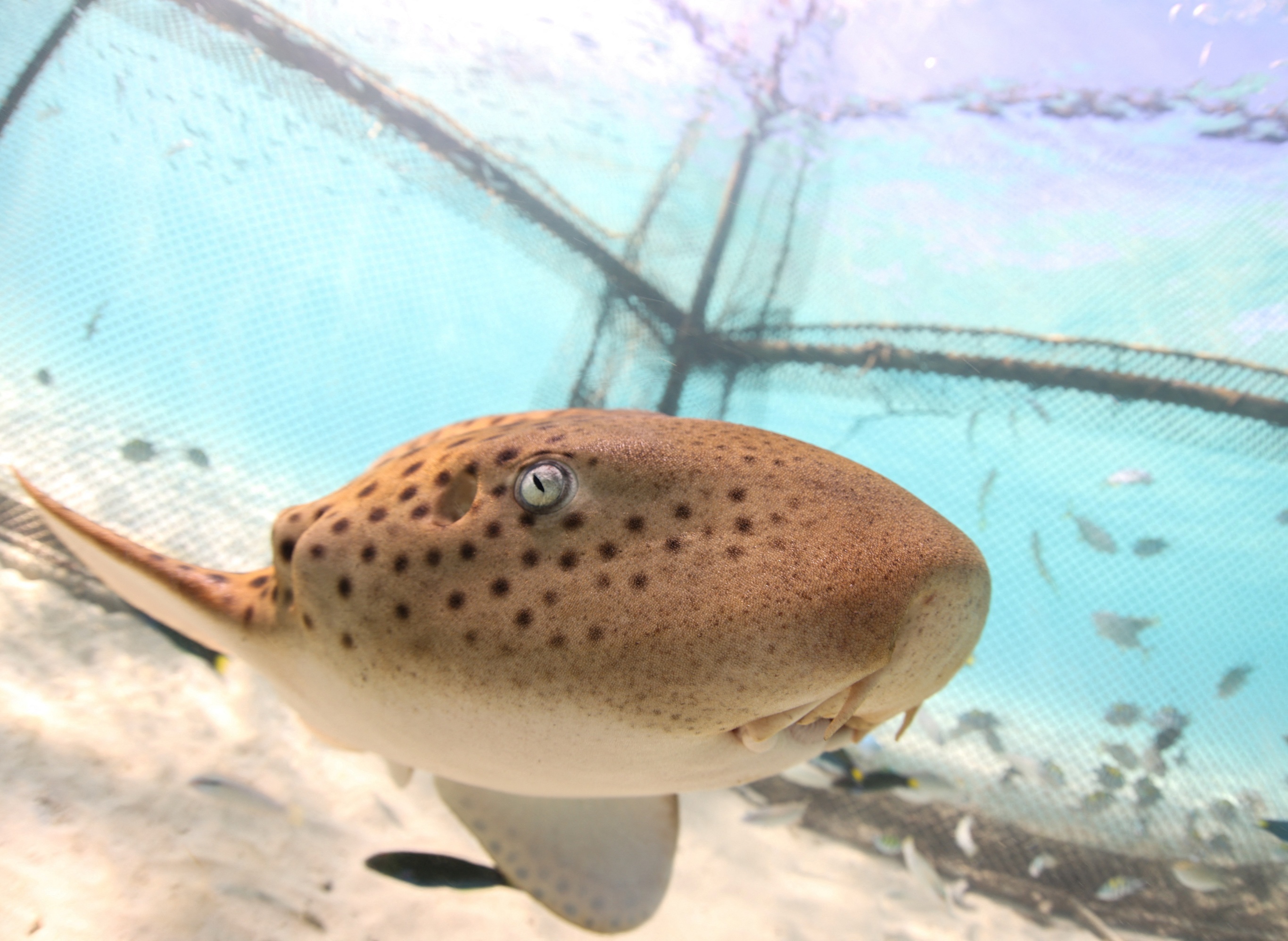 一只幼年印度太平洋豹纹鲨(Leopard shark)正在接受野化训练,普吉岛。泰国海洋与沿海资源部于2025年5月启动「泰国豹纹鲨复苏计划」(StAR),迄今已成功向大海放归7只人工圈养的豹纹鲨。放归野外的豹纹鲨均孵化于普吉水族馆,大约1岁时被转移至海水养殖笼接受野化训练,经过数月训练完全适应大海环境后再进行放生。豹纹鲨主要分布于印度洋和西太平洋近岸水域,身长可达3.5米,受过度捕捞和栖息地丧失威胁,已被列为濒危物种。摄影师:Napat Wesshasartar