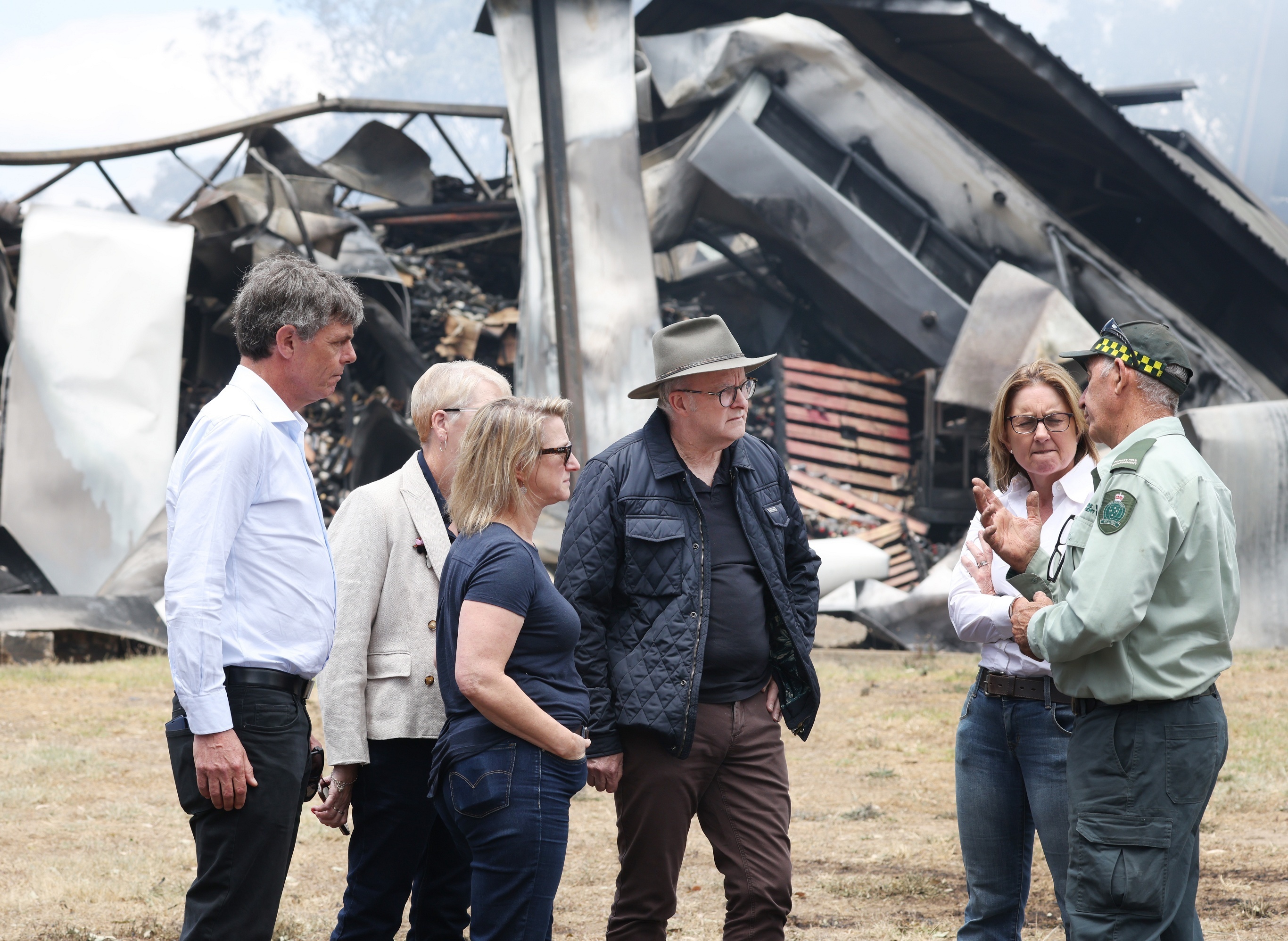 澳大利亚总理 Anthony Albanese 视察维多利亚州山火受灾地区,哈考特镇。1月11日,澳大利亚维多利亚州政府通报该州山火迄今累计烧毁35万公顷土地,造成1人死亡、300栋房屋损毁,为2019年以来该地区遭遇的最严重山火灾害。维州政府已宣布18个市郡及湖山度假村进入灾难状态,并在全州范围内实施禁火令。澳大利亚总理 Albanese 宣布紧急拨款1950万澳元帮助维州民众恢复基本生活。摄影师:David Crosling