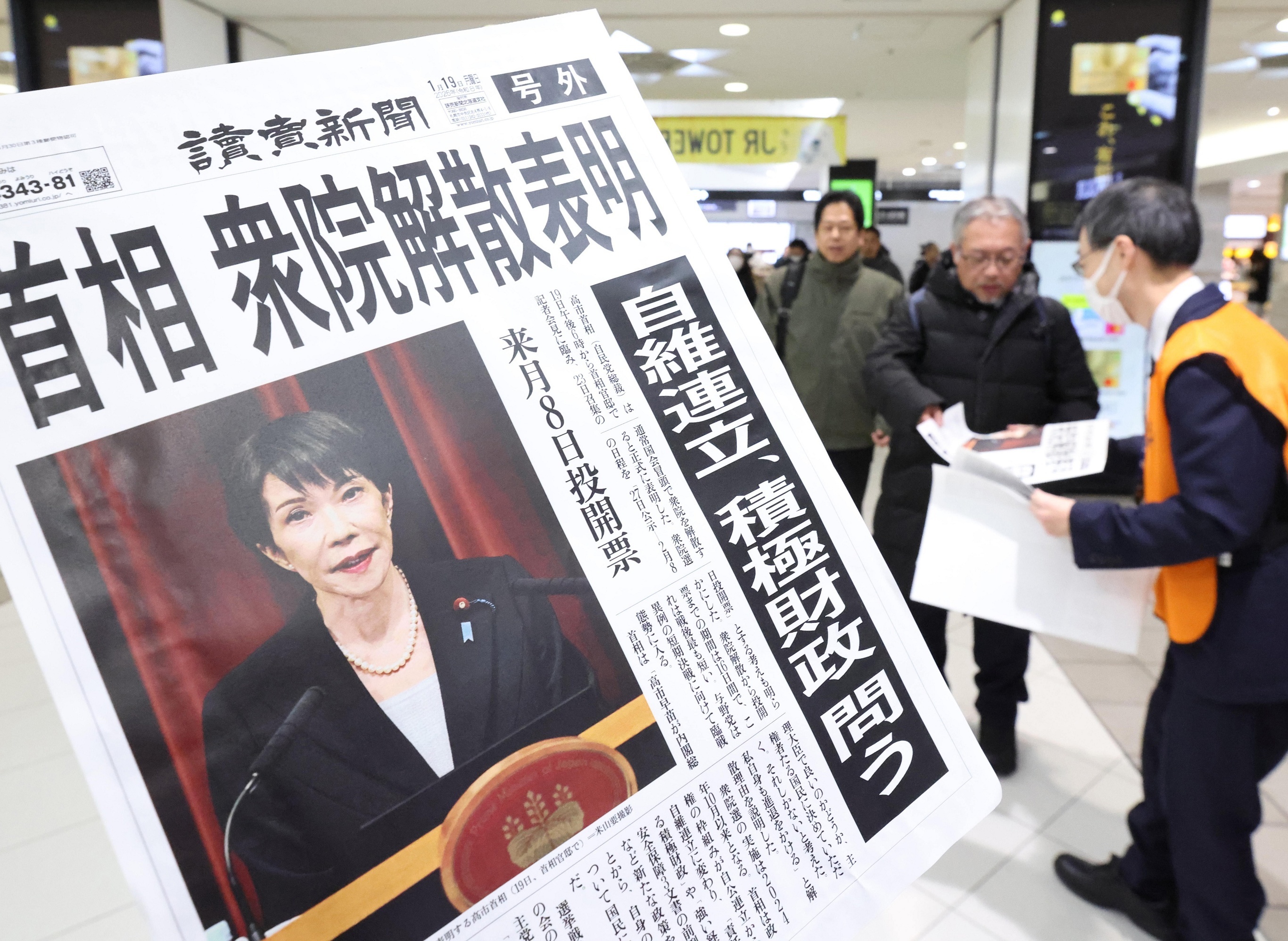 日本《读卖新闻》头版刊登「日本首相高市早苗解散众议院」的报道,札幌市。1月19日,日本首相高市早苗宣布1月23日解散众议院并将于2月8日举行大选投票。她表示此举旨在争取执政党自民党单独赢得过半数议席,从而推行「积极财政政策」和「从根本上加强安全政策」。本次选举从解散众议院到投票日仅间隔16天,为日本二战后筹备时间最短的选举。最新民调显示高市早苗内阁支持率处于67%高位。摄影师:iDaily Media