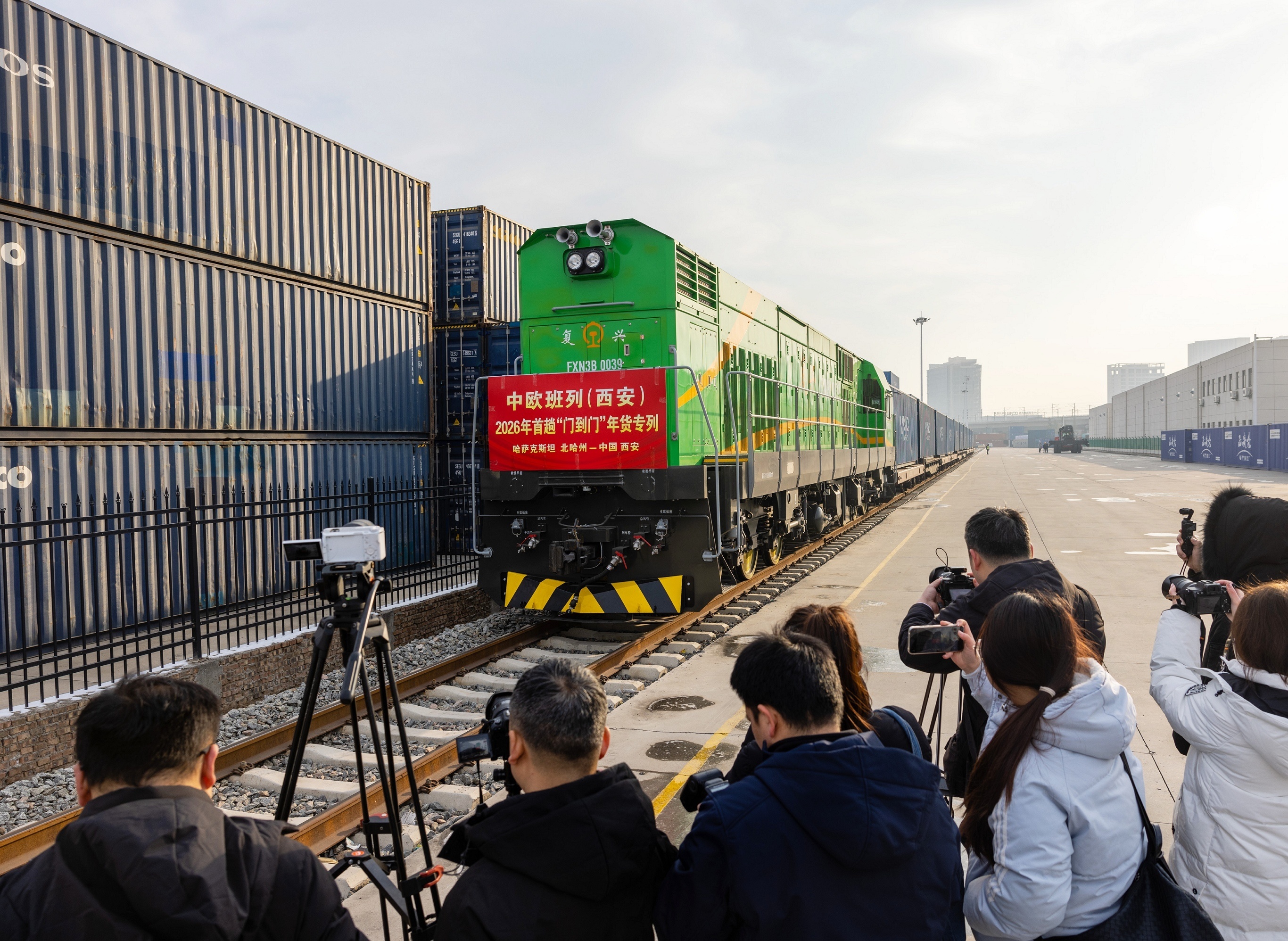 2026年首趟中欧班列「年货专列」抵达西安,陕西省。1月21日,首列装载哈萨克斯坦等共建「一带一路」国家特色商品的中欧班列「年货专列」抵达西安,运抵货物包括成品粮油、蜂蜜等农产品。西安海关统计数据显示2025年中欧班列(西安)累计开行6037列,同比增长21.1%,运送货物总重698万吨,同比增长23.7%,均创历史新高。中欧班列(西安)自2013年开始运行,目前已开通18条国际干线,实现欧亚主要货源地全覆盖。摄影师:iDaily Media