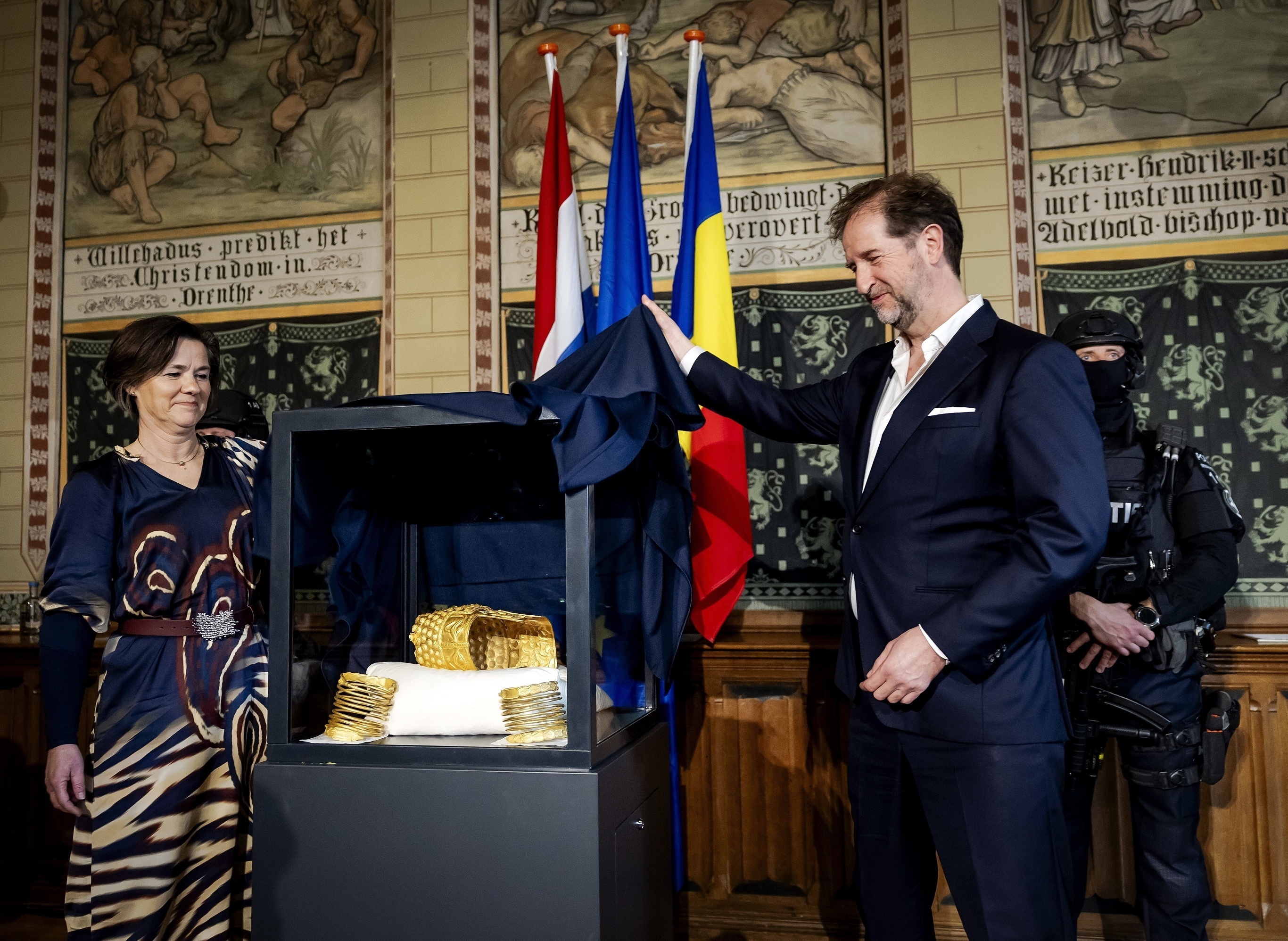 荷兰德伦特博物馆向媒体展示失窃追回的罗马尼亚金头盔和金手镯,阿森。4月2日,荷兰政府检方宣布成功追回德伦特博物馆失窃的多件重要展品,包括一件公元前5世纪的罗马尼亚科托费内什蒂黄金头盔以及2只黄金手镯,追回的黄金头盔表面轻微凹陷,手镯完好无损。这批文物由罗马尼亚国家历史博物馆于2025年1月借展至荷兰德伦特博物馆,展出期间遭到盗窃,目前仍有1只金手镯下落不明。摄影师:Sem van der Wal