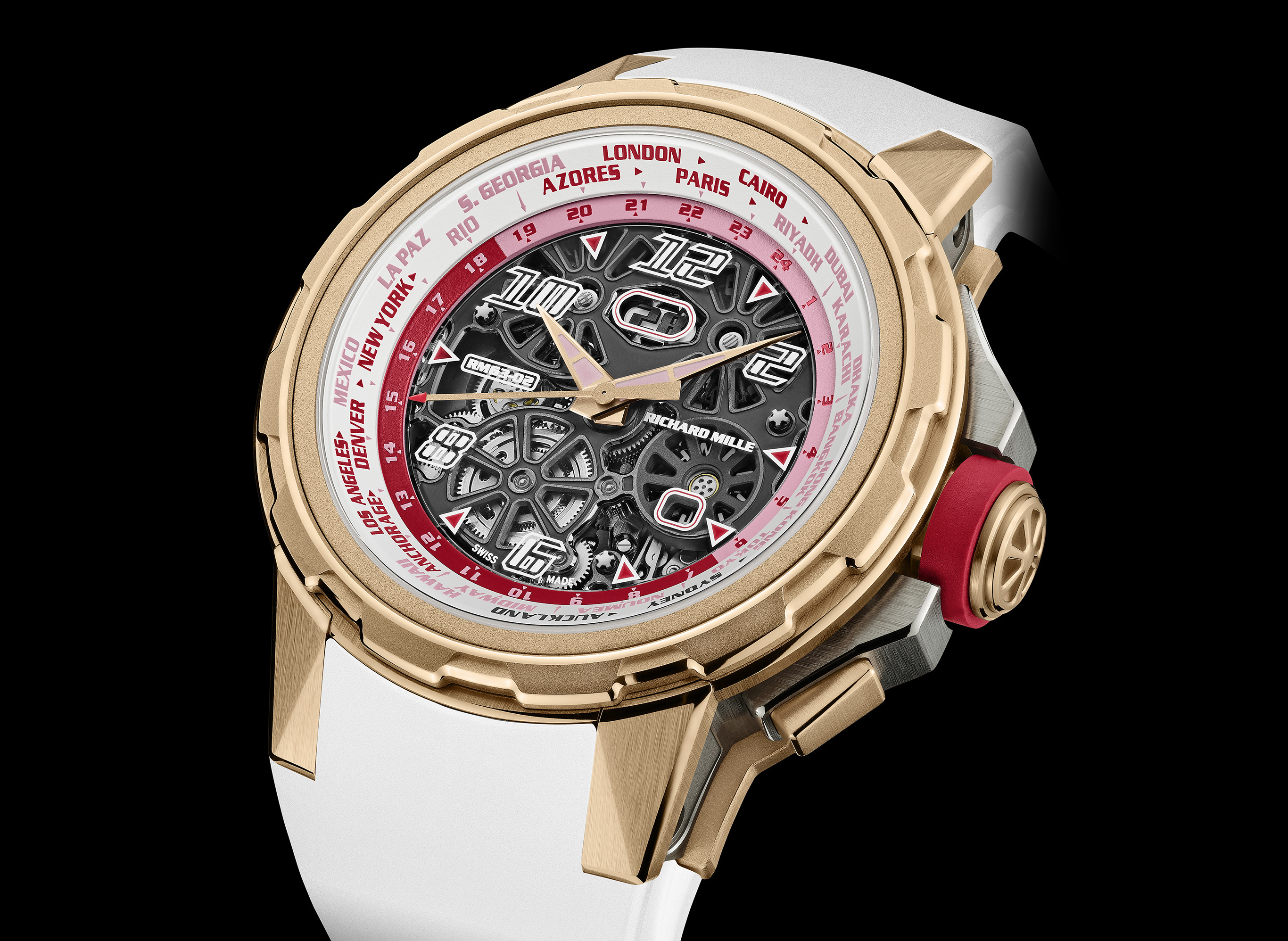 RICHARD MILLE 理查米尔推出 RM 63-02 世界时腕表的全新版本,首次采用玫瑰金表壳搭配白色主题24时区表盘设计,只需要旋转表圈就可以轻松切换不同时区显示,镂空开放式表盘让你随时欣赏高级机械腕表的完美运转。限量100枚。