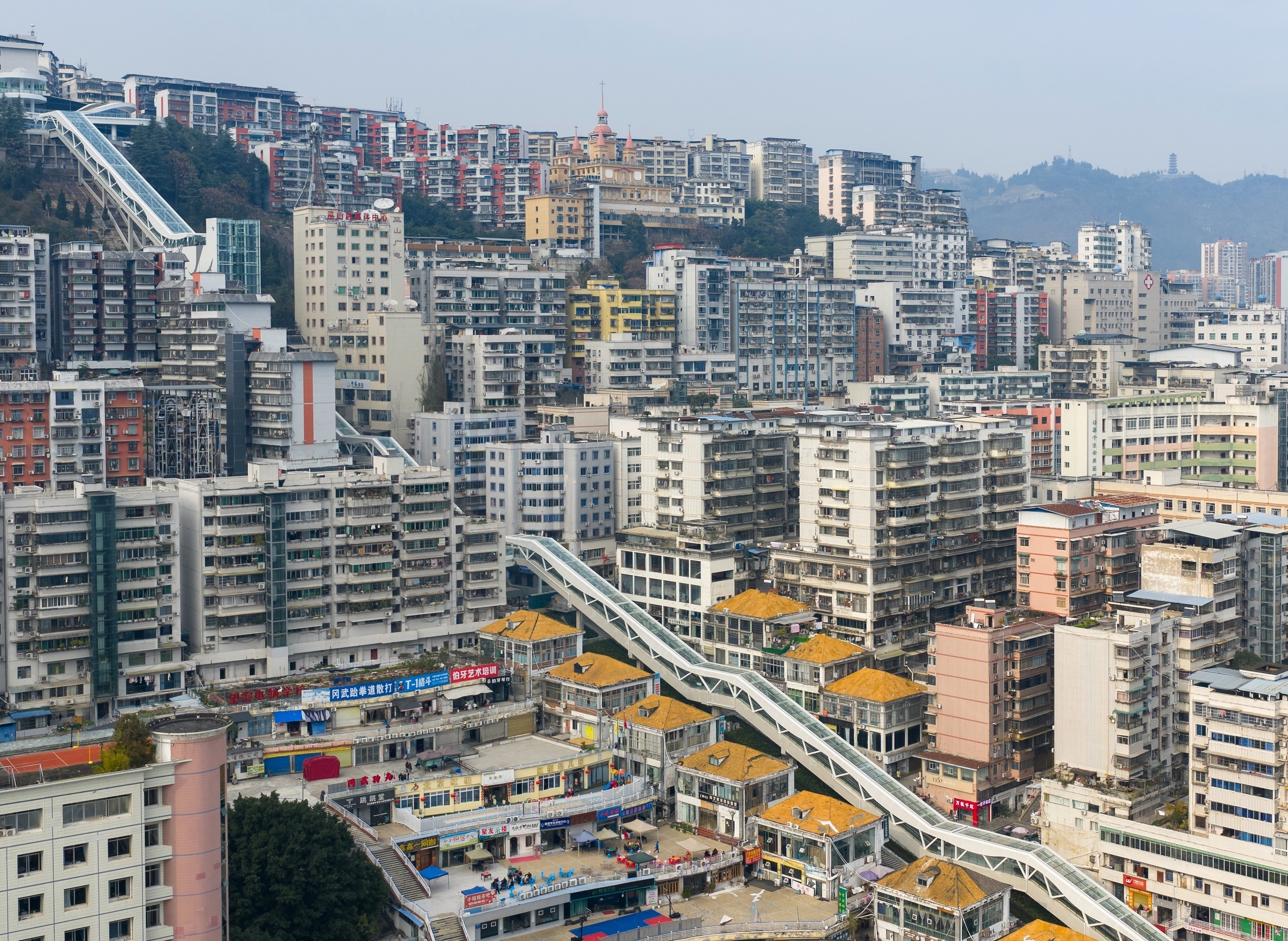 俯瞰即将竣工的重庆巫山神女大扶梯,中国。重庆市巫山县神女大扶梯是一条依托城市中轴线建设的纵向交通要道,总长度905米,垂直高度240米,相当于80层楼。该项目于2024年6月正式动工,共设置21部扶梯、8部电梯、4部自动人行道、2座人行天桥、2座跨线通道,建成投用后将使巫山县上下半城的通行时间由1小时缩短至约20分钟。摄影师:He Penglei