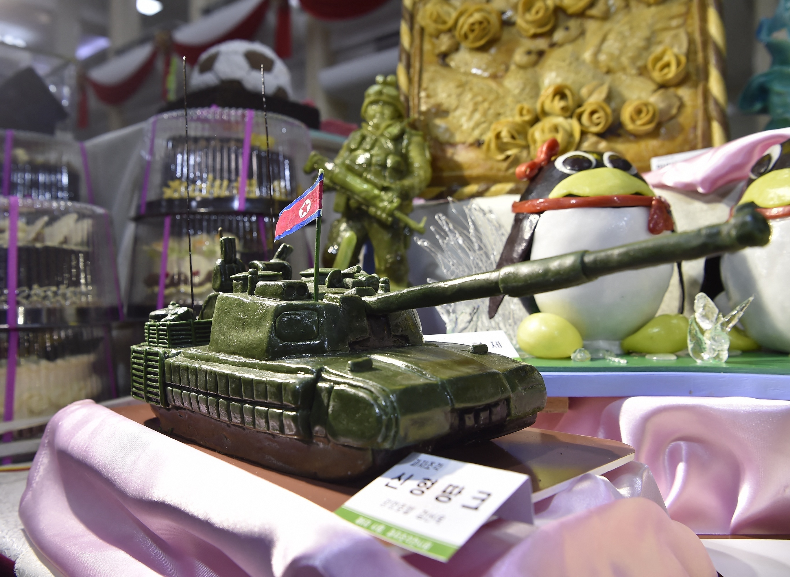 朝鲜首都平壤举办第6届糖果饼干雕塑展,一件坦克造型的甜点正在展出。4月8日,平壤清流馆举行糖果饼干雕塑展以迎接「4·15」金日成诞辰「太阳节」,本届主题为「我们丰富多彩的饮食生活」,主要展出以朝鲜建筑、卡通人物、动植物等为造型的甜点作品,形式包括糖果、糕点和巧克力,制作单位包括平壤酒店、金杯体育中心食品厂等。摄影师:Kim Won Jin