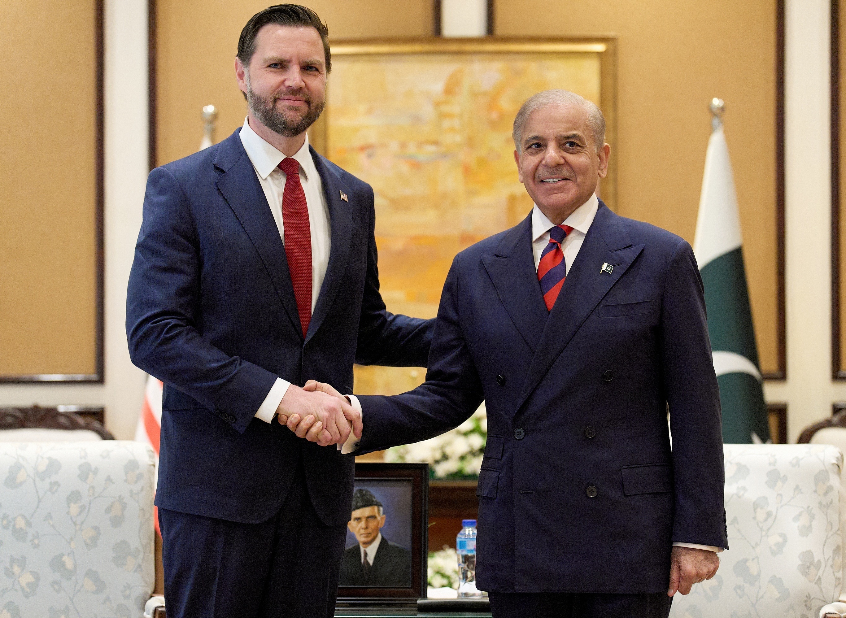 美国副总统、美伊谈判代表团团长 JD Vance 会见巴基斯坦总理 Shehbaz Sharif,伊斯兰堡。4月12日凌晨,美伊两国代表团在巴基斯坦首都伊斯兰堡结束长达21小时的直接谈判,最终未达成任何协议。美国副总统 Vance 在记者会上称美方敦促伊朗做出「不寻求核武器的明确承诺」,但是伊朗未接受美国提出的「最终、最佳」方案。伊朗外交部发言人表示本次谈判是在「互不信任」的气氛中进行的,伊方未寄希望于达成协议,美伊在两三个关键问题上存在重大分歧。目前美伊代表团均已离开巴基斯坦,下一轮谈判时间尚不确定。摄影师:Jacquelyn Martin