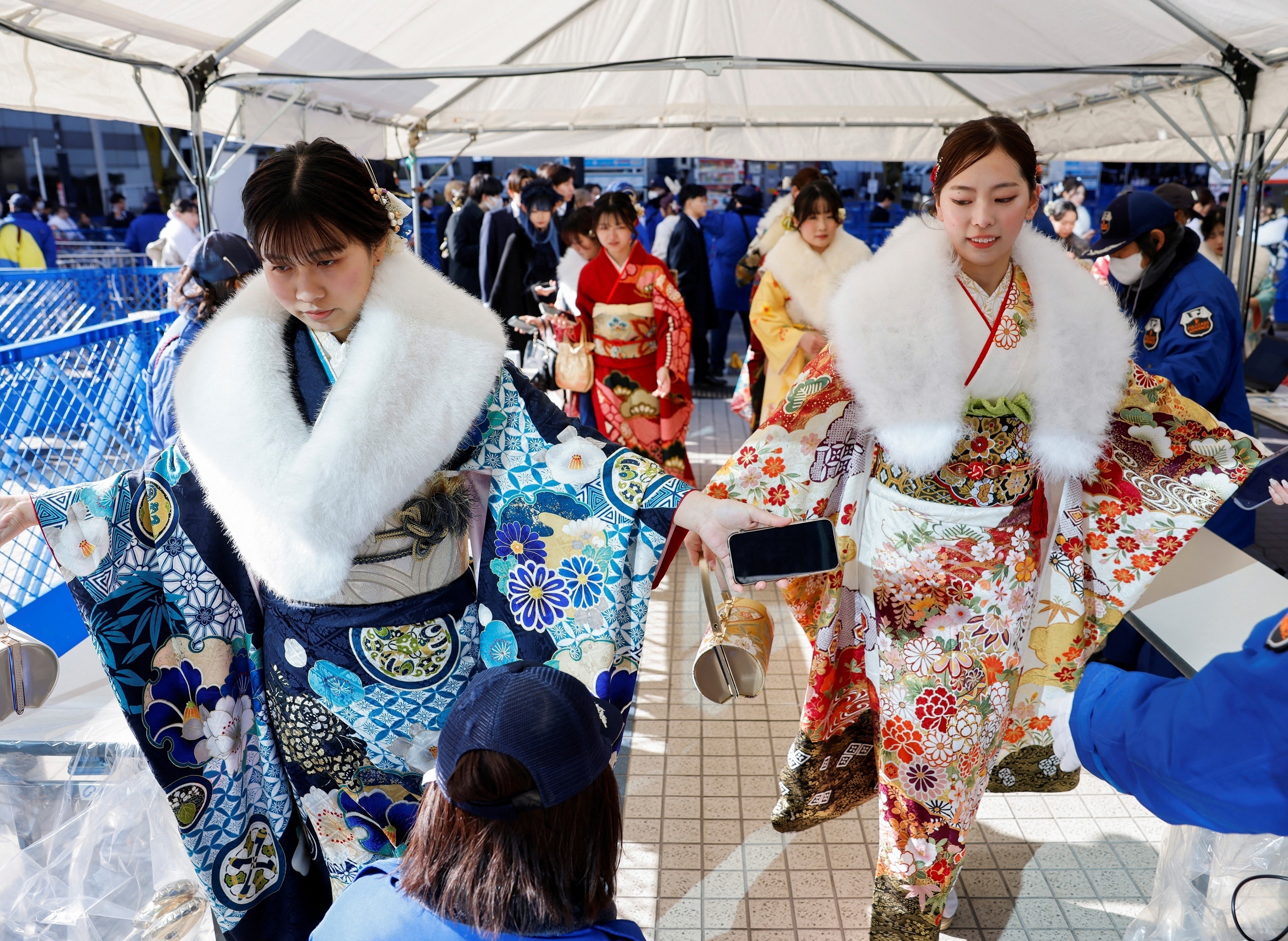 日本年轻女孩准备参加成人礼仪式,横滨。1月12日,横滨体育馆举行一年一度的成人礼仪式,本年度共有2.2万名年满20岁的年轻人参加,出生日期均在2005年4月至2006年4月之间。日本总务省统计数据显示2026年日本共有109万居民年满18周岁,为有记录以来第二低,其中女性约53万人,男性约56万人。日本综合研究所估计2025年日本出生人数约为66.5万人,同比下降-3%,连续第10年创历史新低。摄影师:Manami Yamada