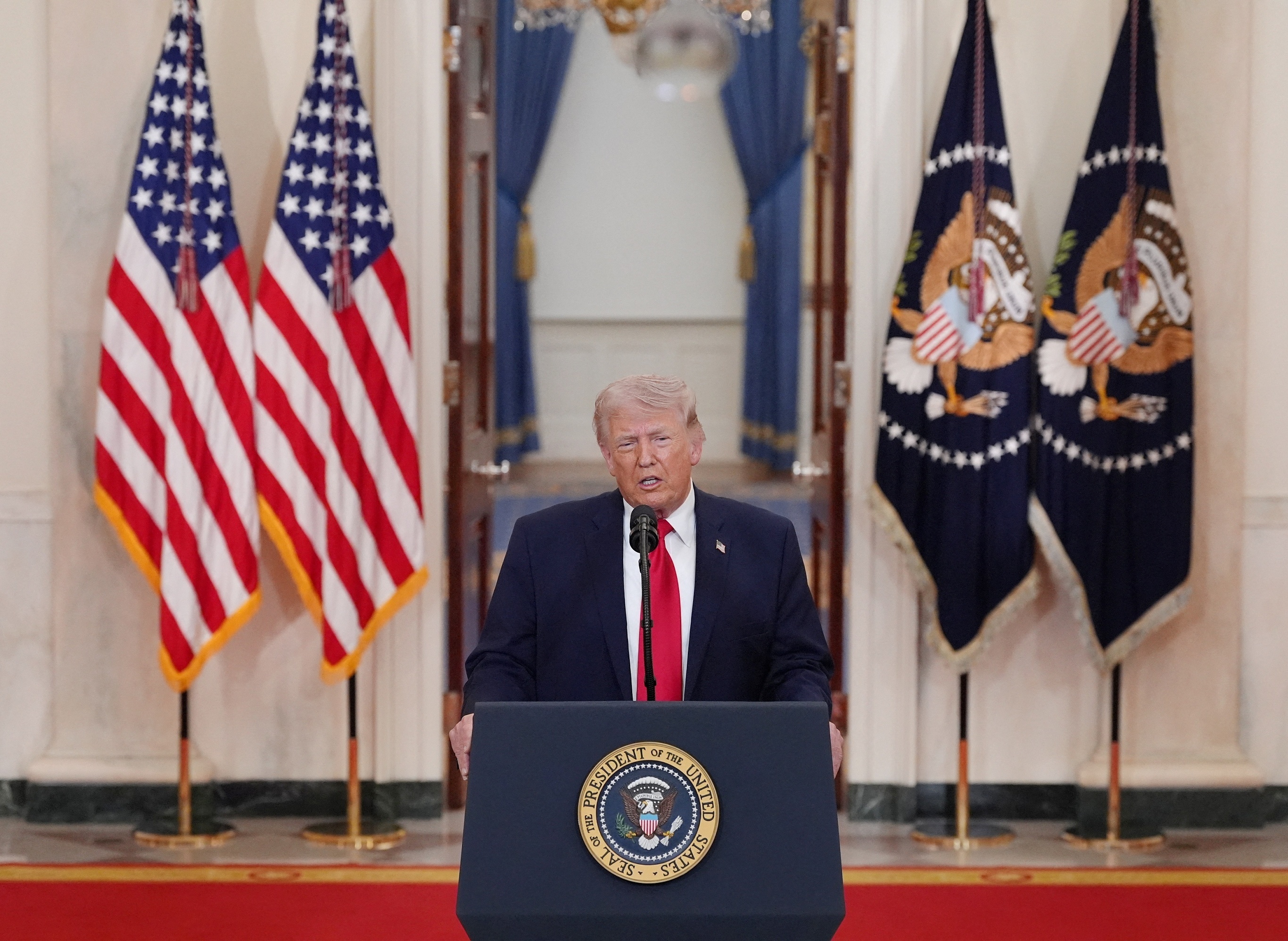 美国总统 Donald Trump 针对伊朗战争发表全国讲话,华盛顿白宫。4月1日,美国总统 Trump 宣布对伊朗军事行动已取得「迅速、果断、压倒性的胜利」,包括彻底摧毁伊朗海空军、消灭伊朗政权领导人以及大幅削弱伊朗发射导弹和无人机的能力。Trump 宣布未来2至3周将继续对伊朗进行猛烈打击,直至将对方打回石器时代。Trump 宣称美国已基本摧毁伊朗,建议依赖霍尔木兹海峡获取石油的国家从美国购买石油或自己夺取该海峡。摄影师:Alex Brandon
