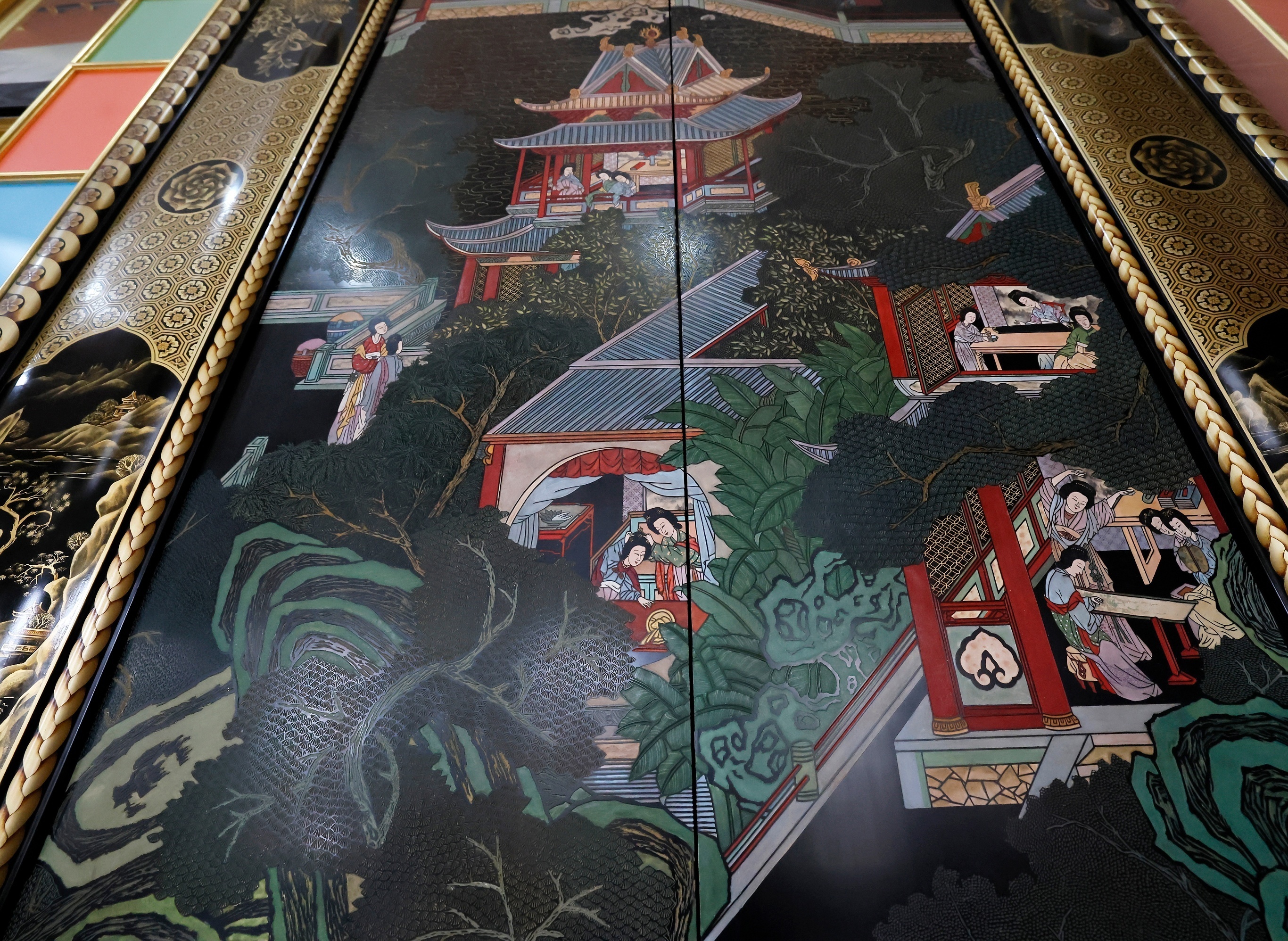俄罗斯叶卡捷琳娜宫举行中国厅修复工程的媒体预览活动,圣彼得堡。3月27日,俄罗斯皇村国家博物馆宣布叶卡捷琳娜宫中国厅的修复工程已进入最后安装阶段,预计2026年6月正式对外开放。叶卡捷琳娜宫中国厅建于18世纪,曾经是叶卡捷琳娜二世日常办公和会客的房间,大厅墙面装饰中式风格漆板,绘有道教神仙、亭台楼阁等装饰元素,面积近170平方米。叶卡捷琳娜宫中国厅在二战期间严重损毁,本次修复工程新安装的漆板由中方工匠耗时2年参照文物图像复原制作。摄影师:Anatoly Maltsev