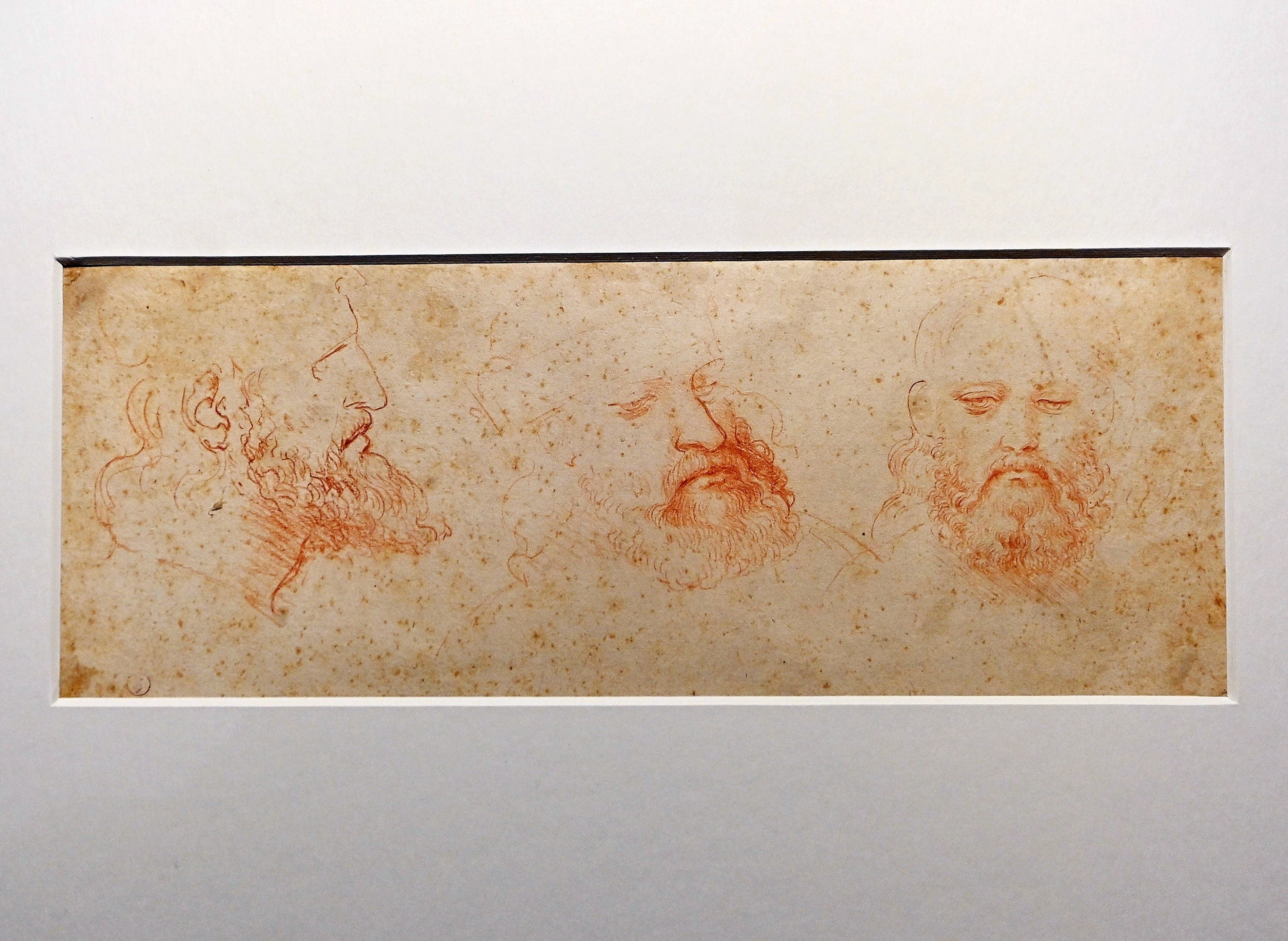 意大利都灵皇家博物馆萨沃伊画廊举办「与达芬奇面对面」特展,一幅意大利文艺复兴时期画家 Leonardo da Vinci 素描作品《带胡须的男人头部三视图》正在展出。这幅粉笔素描创作于约1502年,尺寸为110x283毫米,推测是雕塑设计的草稿,描绘了一名蓄须男性正面、四分之三侧面和正侧面3个不同角度的脸庞特写,展现出达芬奇对人物面部的敏锐观察与分析能力。展期持续至6月28日。摄影师:Alessandro di Marco