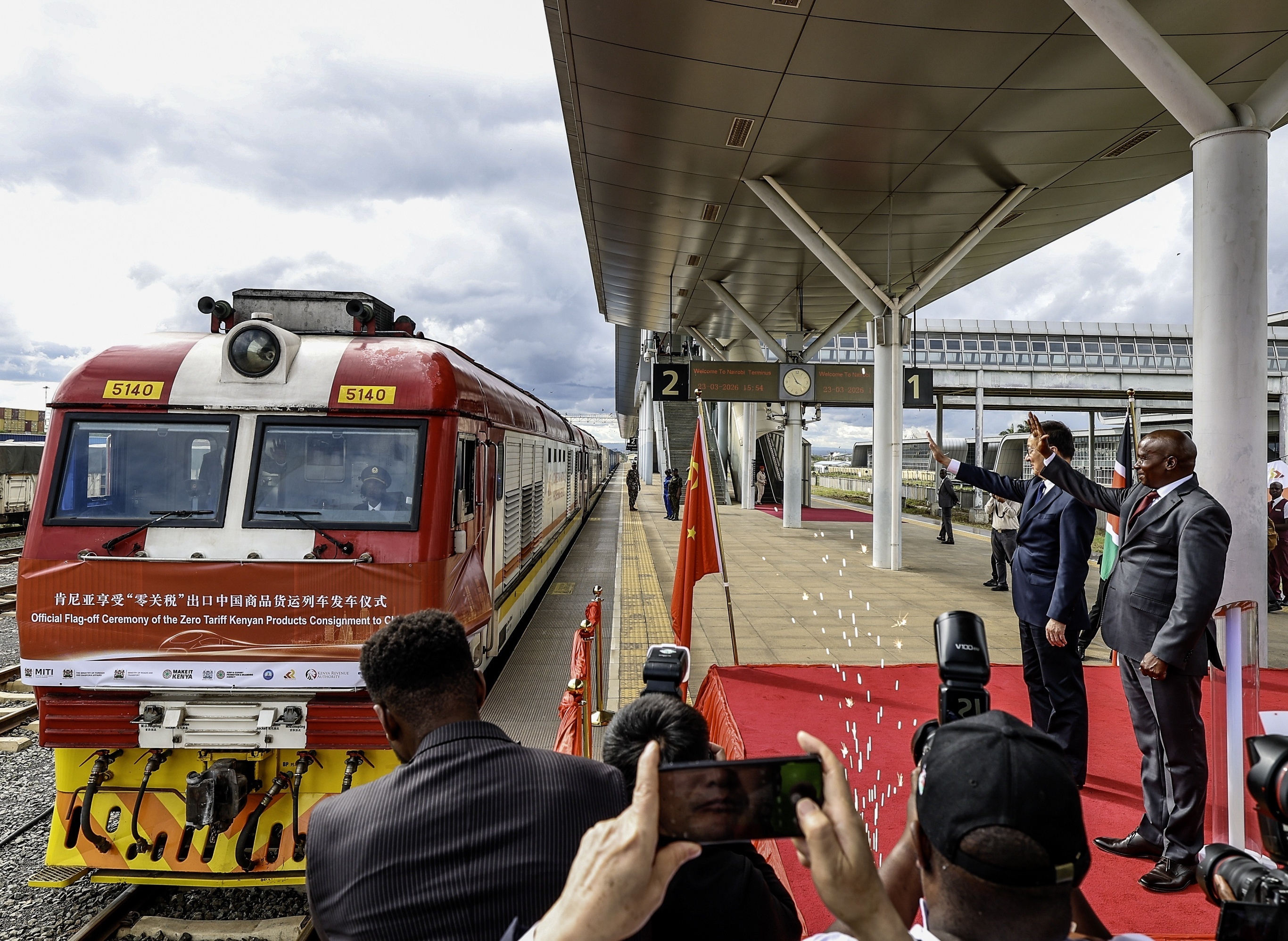 中国国家副主席韩正与肯尼亚副总统 Kithure Kindiki 出席首列肯尼亚零关税输华商品货物列车发车仪式,内罗毕。3月23日,首列载有肯尼亚零关税输华商品的货运列车从内罗毕车站发车,装载货物包括咖啡、茶叶、夏威夷果、牛油果和矿产等肯尼亚本土商品。中国连续17年保持非洲最大贸易伙伴国地位。2025年中非双边贸易额达24905.27亿元人民币,同比增长18.4%。中国政府宣布将从2026年5月1日起对53个非洲建交国全面实施「零关税」举措。摄影师:Daniel Irungu
