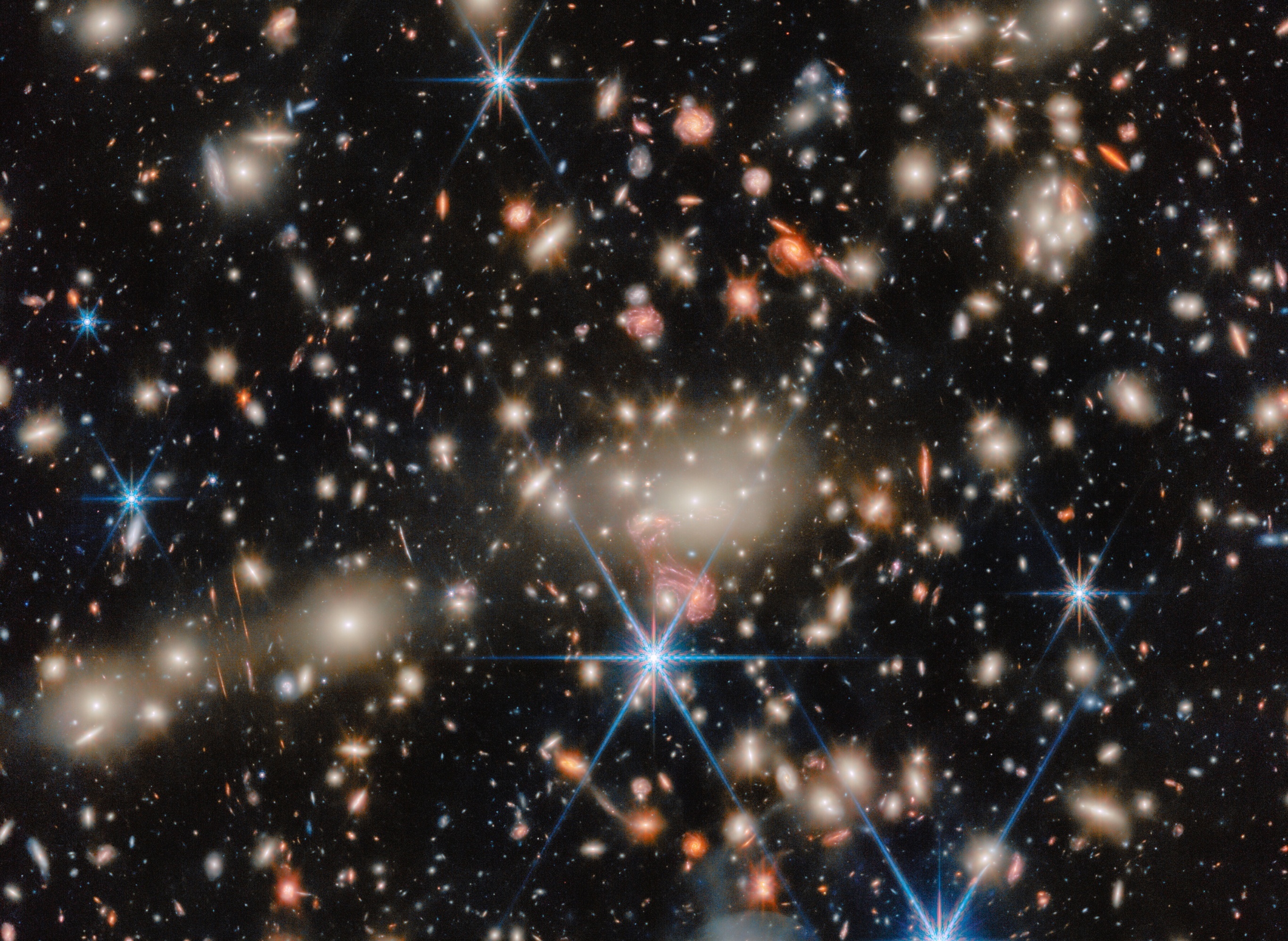 欧空局公布一张 JWST 太空望远镜拍摄的狮子座「MACS J1149」星系团照片,中央区域的弧形光带是引力透镜作用放大的遥远星系。这个星系团距离地球约50亿光年,包含超过300个星系,质量相当于500万亿个太阳。该星系团因质量巨大而具有引力透镜效应,天文学家在2018年通过该星团观测到当时已知最遥远、距离地球约140亿光年的恒星「伊卡洛斯」(Icarus)。摄影师:ESA