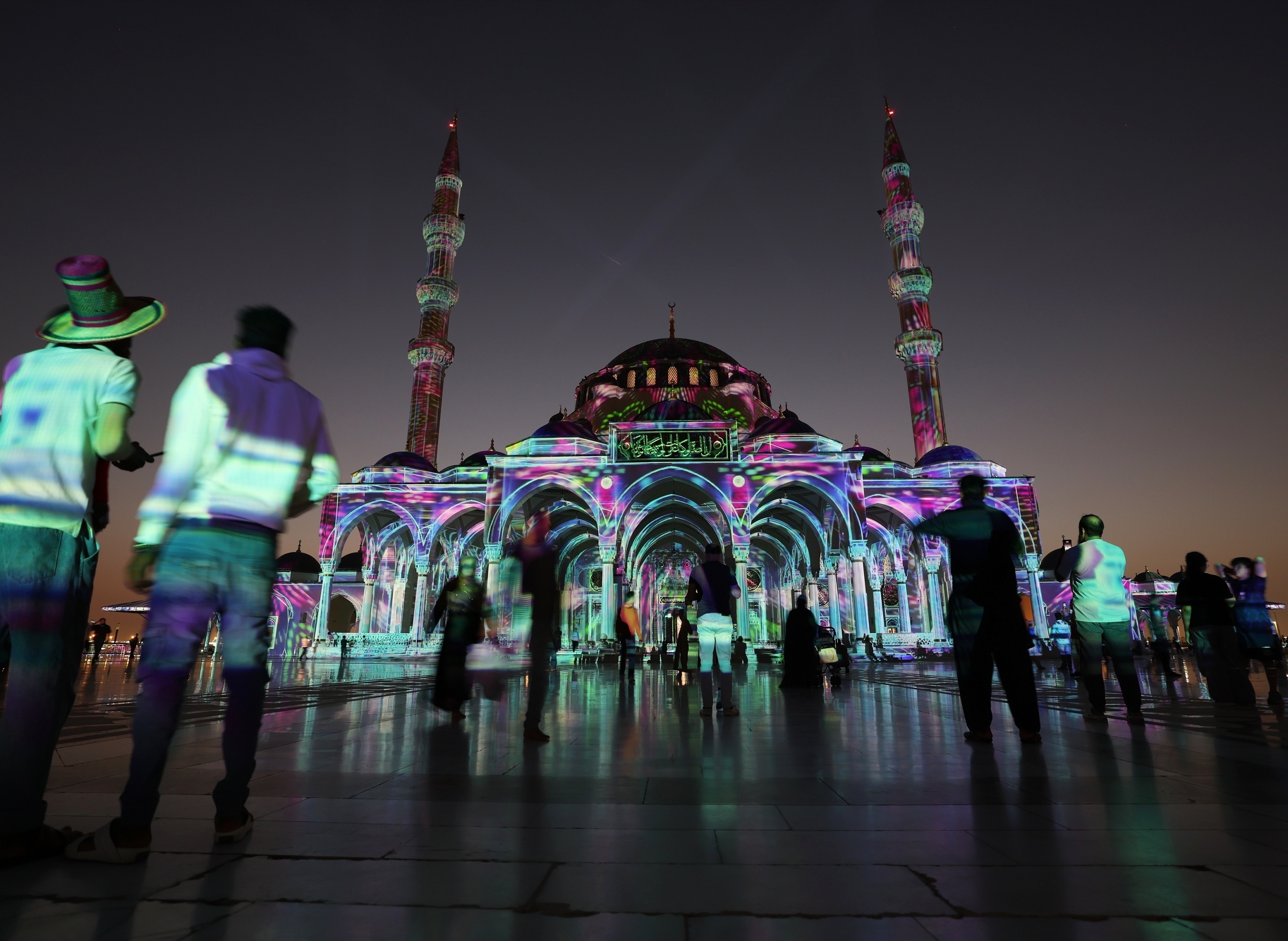 第15届阿联酋沙迦灯光节,沙迦清真寺墙壁上投映灯光秀。本届灯光节从2月3日持续至15日,主题为「归属之光」(Reflections of Belonging),将在阿联酋境内13个地标性建筑和景点举办灯光秀,包括沙迦清真寺、拉菲萨大坝、霍尔法坎瀑布、阿尔达伊德堡等。阿联酋政府数据显示2025年旅游业收入达到2573亿迪拉姆(约合700亿美元),贡献国民经济总量的13%。摄影师:Ali Haider