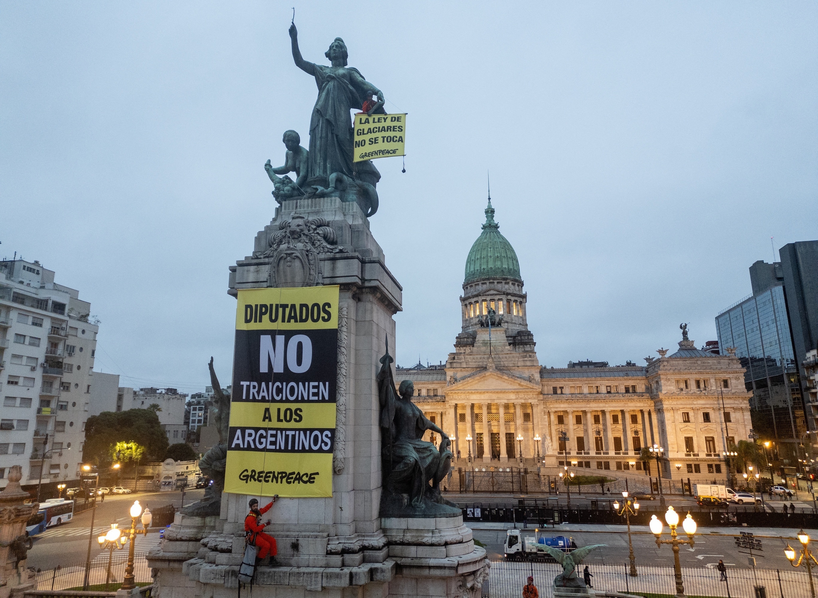阿根廷环保组织在国会大厦前抗议修改《冰川保护法》,布宜诺斯艾利斯。4月9日,阿根廷众议院以137票赞成、111票反对、3票弃权的投票结果通过《冰川保护法》修正案,该法案将授权各省重新划定冰川保护范围,并允许在冰缘地带进行勘探采矿活动。阿根廷冰雪与冰川研究所数据显示,该国冰川总面积约为8484平方公里,其中采矿活动集中的西北部地区冰川储备在过去10年减少-17%。摄影师:Tomas Cuesta
