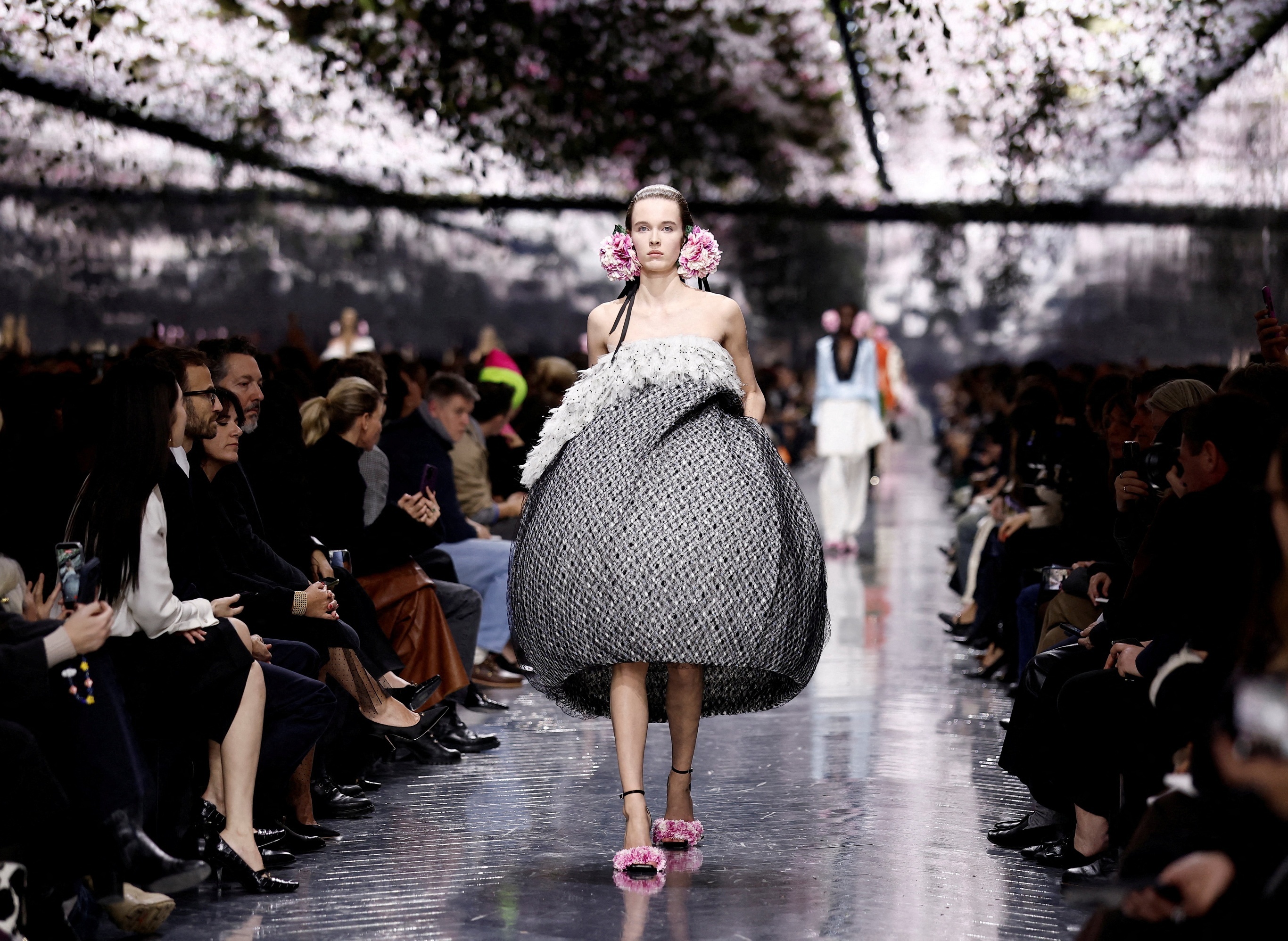 巴黎 2026 春夏高定时装周 Dior 秀场,模特们正在展示品牌创意总监 Jonathan Anderson 的首个高级定制时装系列,罗丹美术馆。本季 Dior 高定作品从自然中采撷灵感,设计师以前任创意总监 John Galliano 赠送的仙客来花束和肯尼亚陶艺家 Magdalene Odund 的陶瓷作品为灵感索引,将品牌标志性 New Look 廓形与充满实验性的雕塑感剪裁融合,搭配真丝裁剪的写实风格花朵耳饰、镶嵌宝石和陨石碎片的手镯等配饰,探索高级定制技艺与大自然恒动不息的演化和传承。摄影师:Benoit Tessier