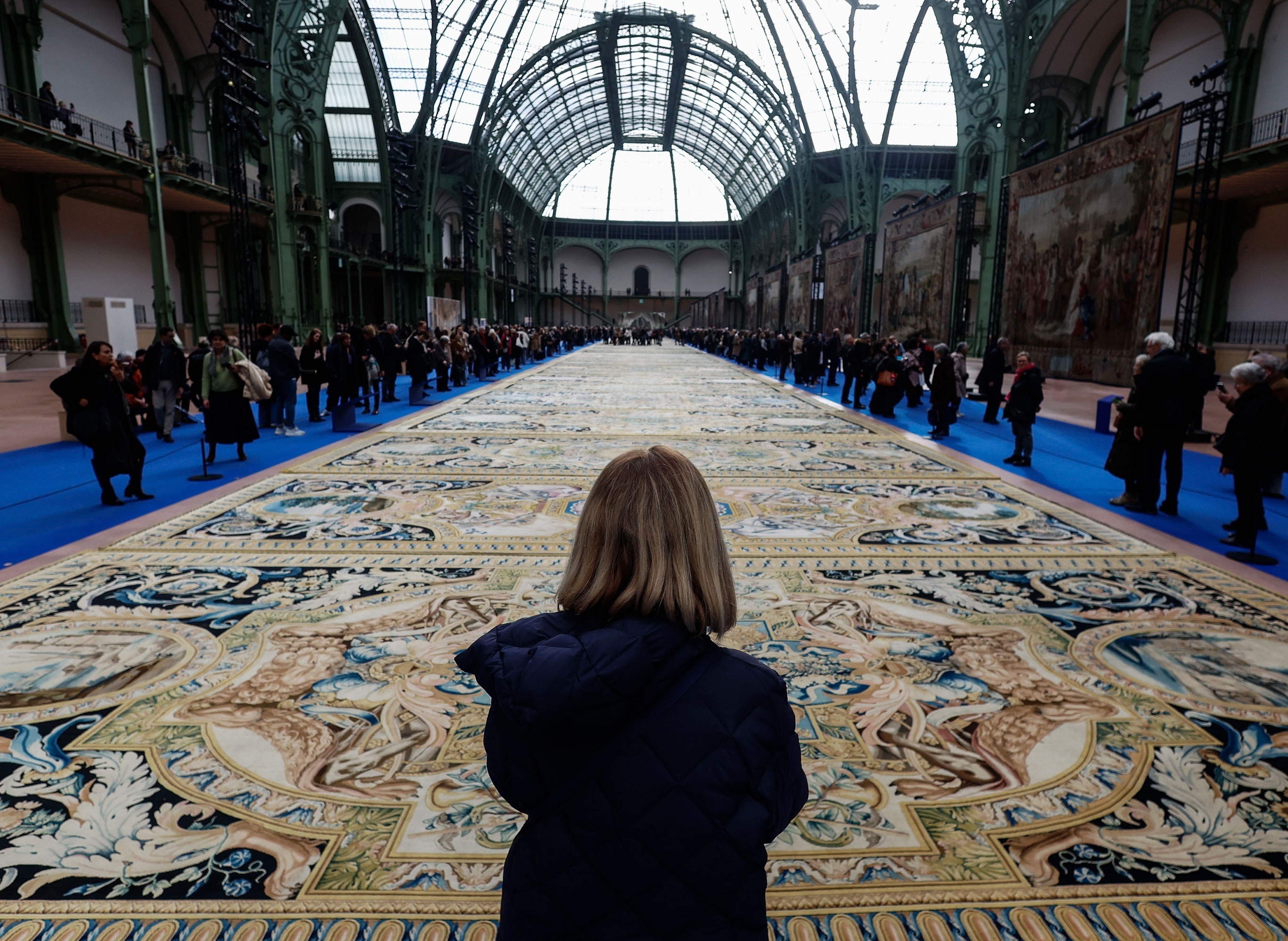 巴黎大皇宫举办「太阳王失而复得的瑰宝」特展,游客们正在参观展出的17世纪宫廷巨幅地毯。法国太阳王路易十四曾在1668年下令萨沃内里地毯工坊制作92张巨幅地毯,用于装饰卢浮宫422米长的大画廊。法国宫廷被路易十四迁至凡尔赛宫后,这批地毯未按计划铺设到卢浮宫,部分地毯在大革命期间被出售流散,仅有41张依然保存在法国国家地毯工坊。本次展览将展出30张保存完整的原始地毯,为这批艺术品首次大规模集体亮相,展期持续至2月8日。摄影师:Mohammed Badra