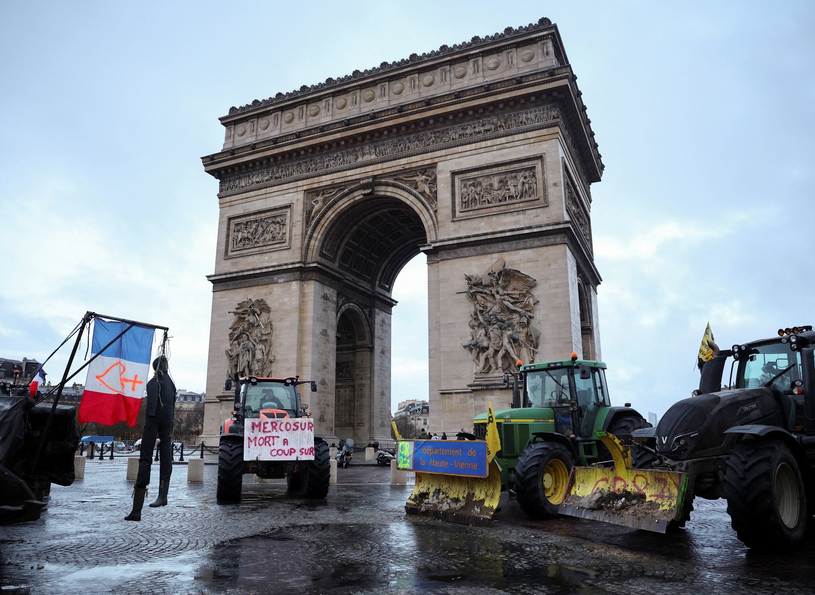 法国农民驾驶拖拉机封堵凯旋门,抗议欧盟与南方共同市场签署自贸协定。1月8日,法国右翼农协团体驾驶约100辆拖拉机封堵凯旋门、埃菲尔铁塔等地标景点周边道路,要求法国政府采取行动阻止欧盟-南方共同市场自贸协议的签署。欧盟各成员国将于1月9日投票表决谈判历时长达20年的欧盟-南方共同市场自贸协议。根据这份协议内容,欧盟将向南美洲国家开放牛肉、糖、乙醇、蜂蜜等农产品市场,南美洲国家则降低对欧洲汽车、服装、食品、葡萄酒和药品的关税。德国、西班牙、意大利等欧盟主要成员国已宣布支持该协议,法国总统 Emmanuel Macron 则明确表态持反对立场。摄影师:Sarah Meyssonnier