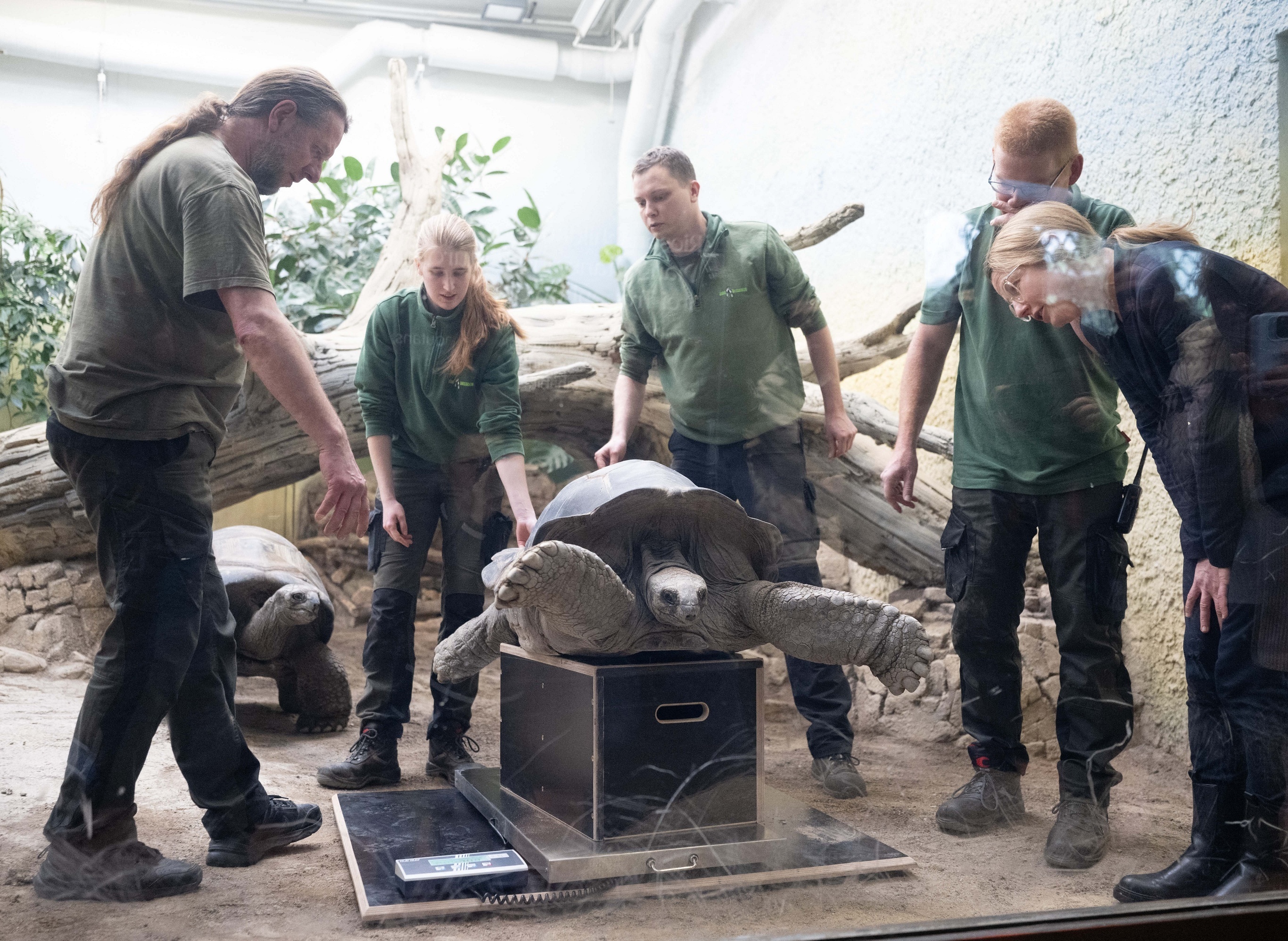 德国德累斯顿动物园,工作人员正在为一只亚达伯拉象龟测量体重。亚达伯拉象龟原产自印度洋塞舌尔群岛,是世界上最长寿的动物之一,寿命可达250年,受栖息地减少威胁被列为易危物种。1月14日,德累斯顿动物园进行一年一度的动物盘点,对园内饲养的所有动物进行体长测量和称重。统计结果显示该动物园内现有204种、949只动物,2025年新引入物种包括郁乌叶猴、白鼻浣熊、山鸦和太阳鸟等。摄影师:Sebastian Kahnert
