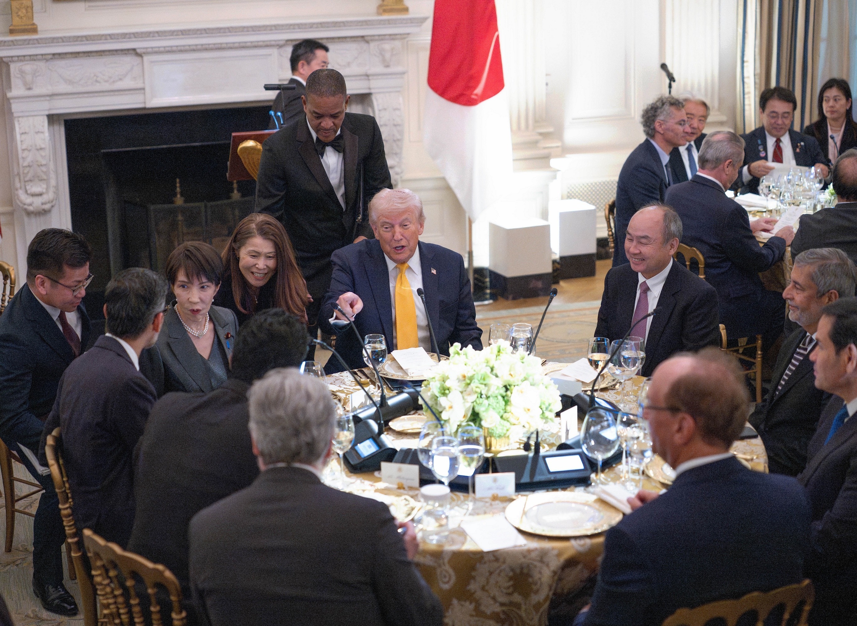 美国总统 Donald Trump 为日本首相高市早苗举行白宫晚宴,华盛顿特区。3月19日,美国总统 Trump 在白宫设宴招待到访的日本首相高市早苗,共有约70名宾客受邀出席,包括谷歌、IBM、波音、OpenAI、软银集团等公司高管。高市早苗在晚宴致辞中高举手臂宣言「日本回来了!」(Japan is Back!),并祝 Trump 的小儿子生日快乐以及祝贺美国建国250周年。根据白宫公布的美日首脑会谈成果文件,美国将继续在日本本土部署先进武器系统,推进联合研制中程空对空导弹,并将日本制造「标准-3型」导弹产量提升至目前的4倍。摄影师:Aaron Schwartz