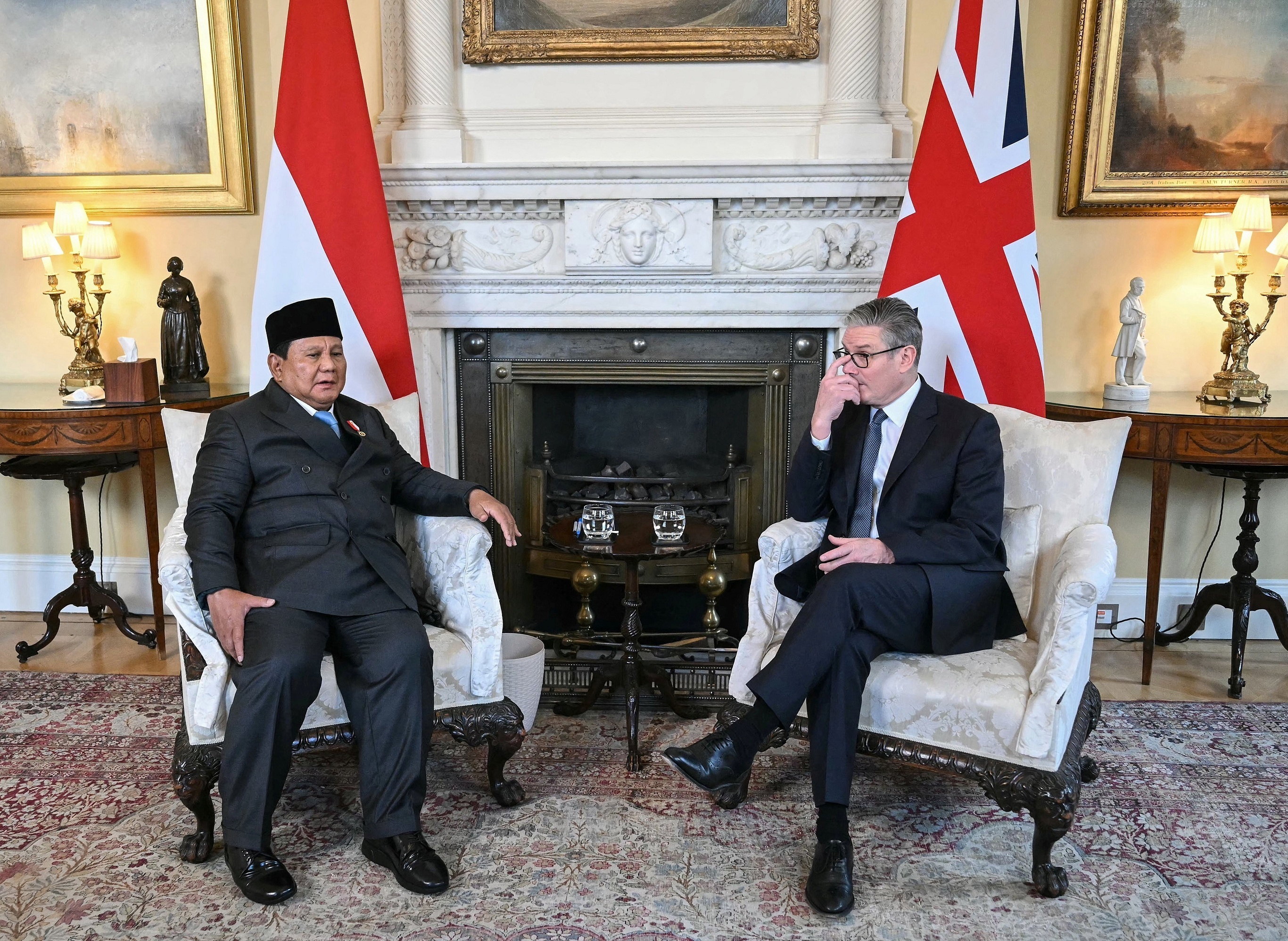 英国首相 Keir Starmer 与印度尼西亚总统 Prabowo Subianto 举行会晤,伦敦。1月18日,印尼总统 Prabowo 应邀对英国进行为期3天正式访问。两国领导人就双边合作和国际事务举行会谈,宣布启动「经济增长伙伴关系」(EGP),加强清洁能源、数字经济、基建交通、教育、农业、贸易投资、供应链韧性等多个领域的合作。2025年1至11月英国与印尼双边贸易额为24亿美元,印尼对英贸易顺差4.59亿美元,同比下降-42%。摄影师:Justin Tallis