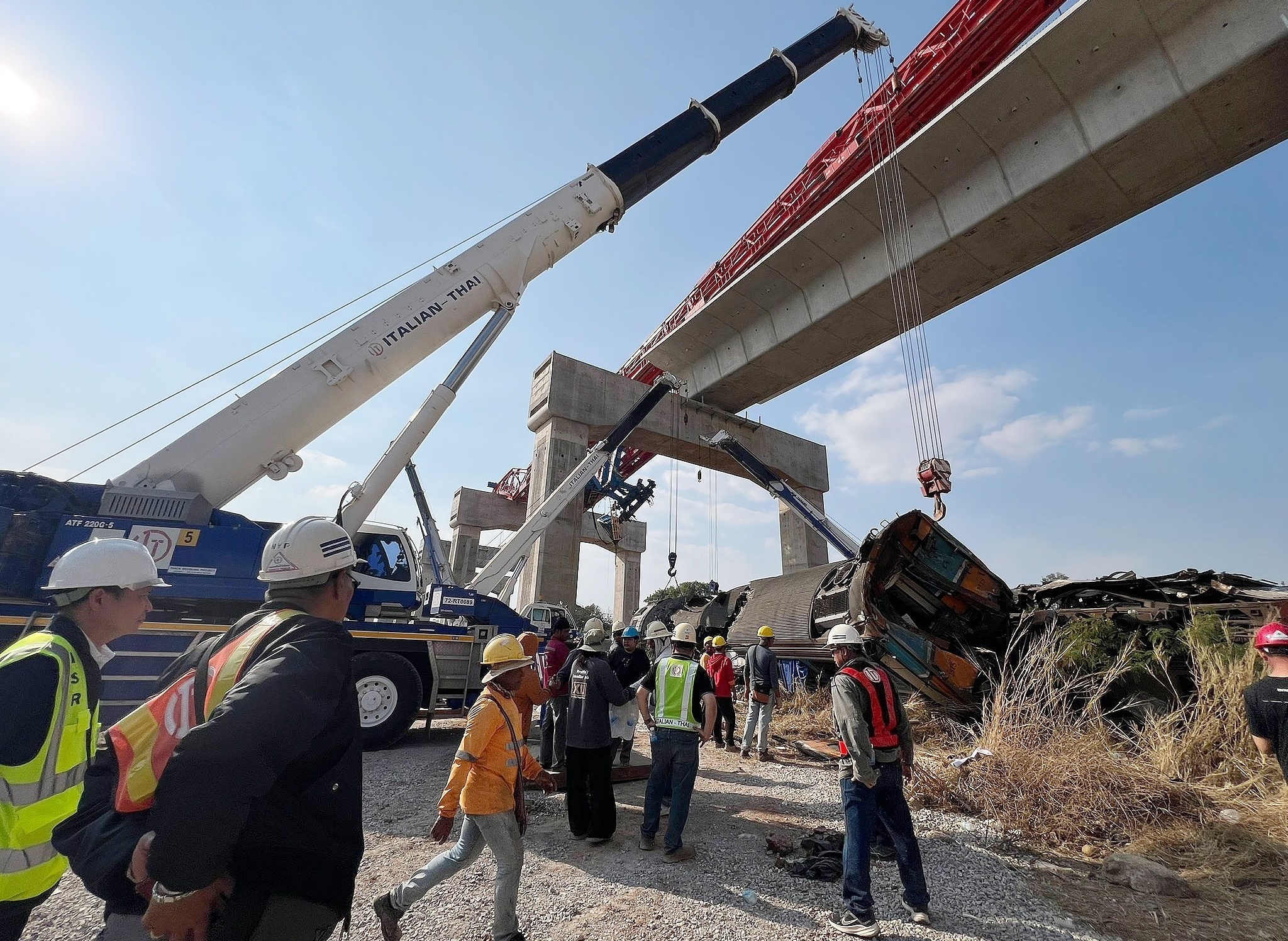 泰国高铁项目发生一起施工设备坠落撞击列车事故,呵叻府。1月14日,泰国呵叻府高铁桥梁建设项目的一台大型起重机在施工过程中倒塌坠落,砸中一列从曼谷驶往乌汶的客运特快列车,造成至少32人死亡、66人受伤。本次事故标段为中泰高铁项目一期工程的一部分,由意大利-泰国发展公共有限公司承建,事故原因仍在调查中。中国驻泰国大使馆确认事发标段无中方施工企业和施工人员参与,暂未发现涉中国公民伤亡情况。摄影师:Narong Sangnak