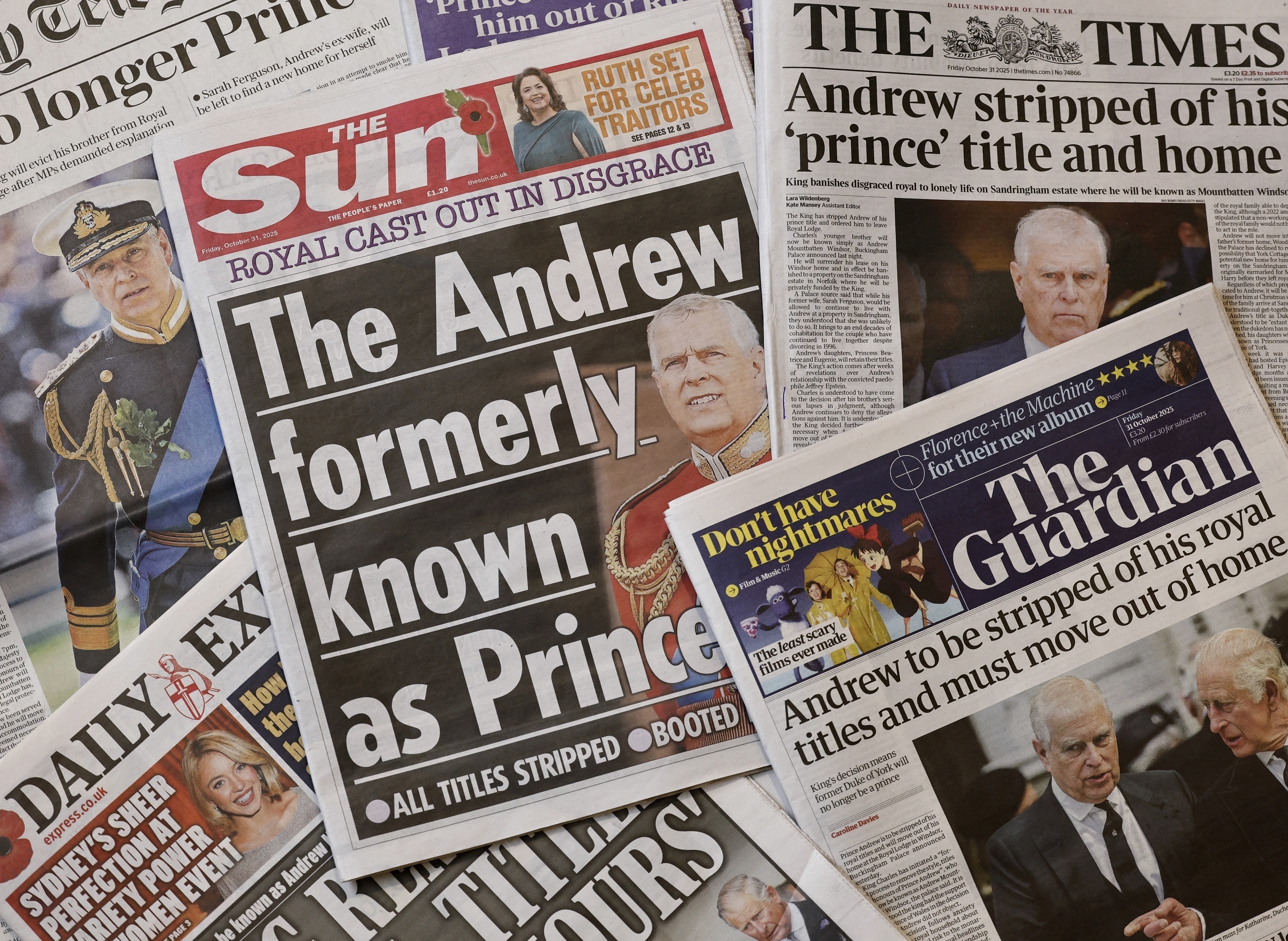 英国报纸刊登英国王室剥夺安德鲁王子头衔的报道,伦敦。10月30日,英国白金汉宫发表声明宣布英王查尔斯三世已正式下令剥夺安德鲁王子的所有尊号、头衔及荣誉,责令其使用本名安德鲁·蒙巴顿·温莎(Andrew Mountbatten Windsor)并搬离王室居所。现年65岁的安德鲁王子是已故英国女王伊丽莎白二世的次子,因陷入美国爱泼斯坦「萝莉岛」丑闻而损害英国王室声誉。最新民调显示91%英国民众对安德鲁王子持负面看法。摄影师:Rhianna Chadwick