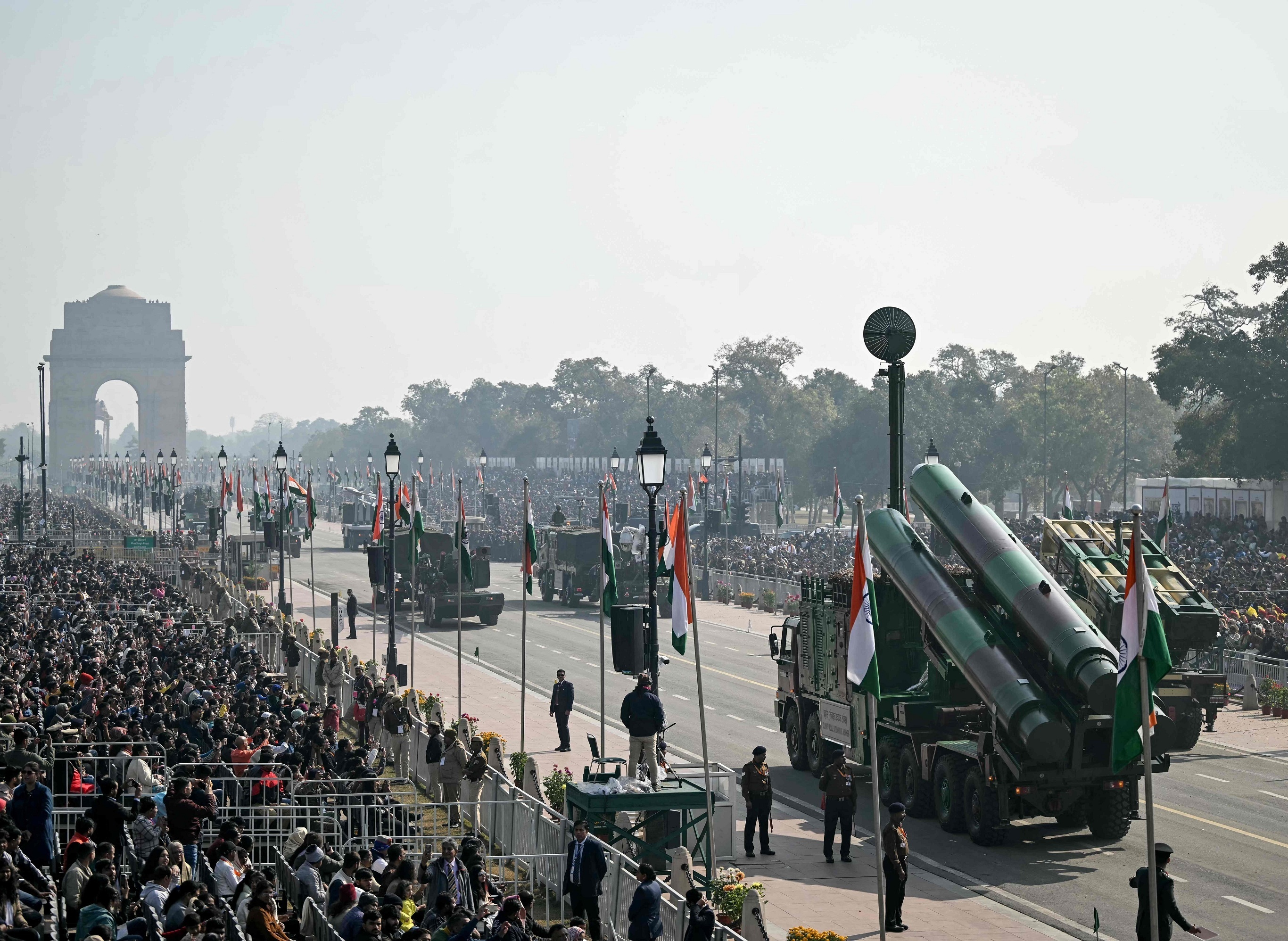 印度共和国日阅兵式在新德里责任大道举行,印俄联合研制的「布拉莫斯」(BrahMos)超音速巡航导弹方队接受检阅。1月26日,印度首都新德里举行阅兵典礼庆祝第77个共和国日,印度总理 Narendra Modi 以及欧盟委员会主席等约1万名嘉宾现场观摩。本次阅兵共有18个方队约6000名士兵、29架飞机接受检阅,亮相武器装备包括「布拉莫斯」超音速巡航导弹、印度国产远程反舰高超音速导弹、「阿卡什」防空系统、「苏里亚斯特拉」火箭炮和「阿琼」主战坦克等。摄影师:Sajjad Hussain