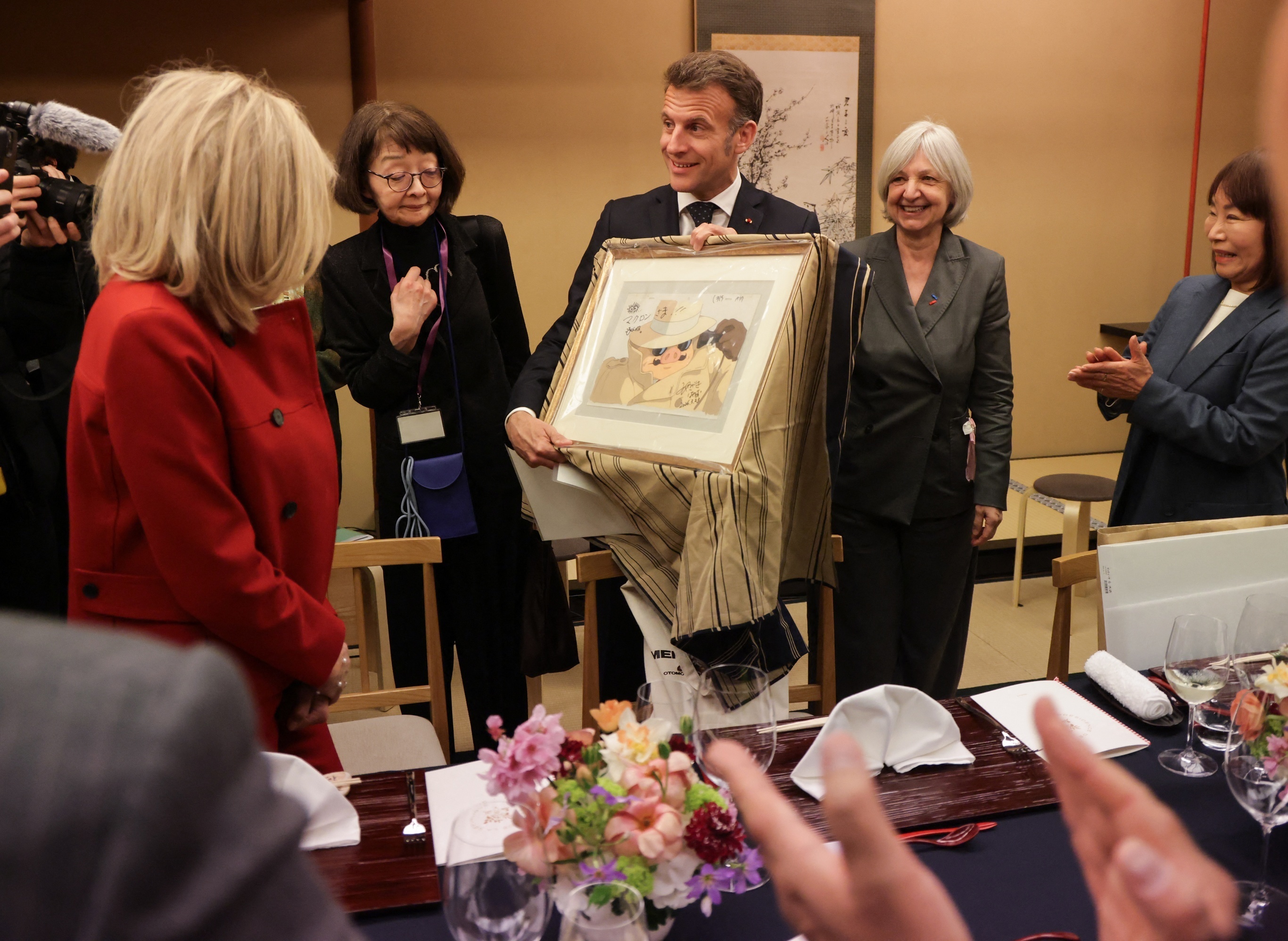 法国总统 Emmanuel Macron 获得日本动画导演宫崎骏赠送的一幅亲笔签名《红猪》画稿,东京。3月31日,法国总统 Macron 对日本进行为期3天正式访问,主要行程包括会晤日本德仁天皇和首相、与日本文化界人士举行会面、出席日法经济论坛、参观日本航天创新企业等。这是 Macron 上任以来第4次访问日本。两国领导人预计将重点就中东局势、能源合作以及人工智能技术等议题展开讨论。摄影师:Ludovic Marin