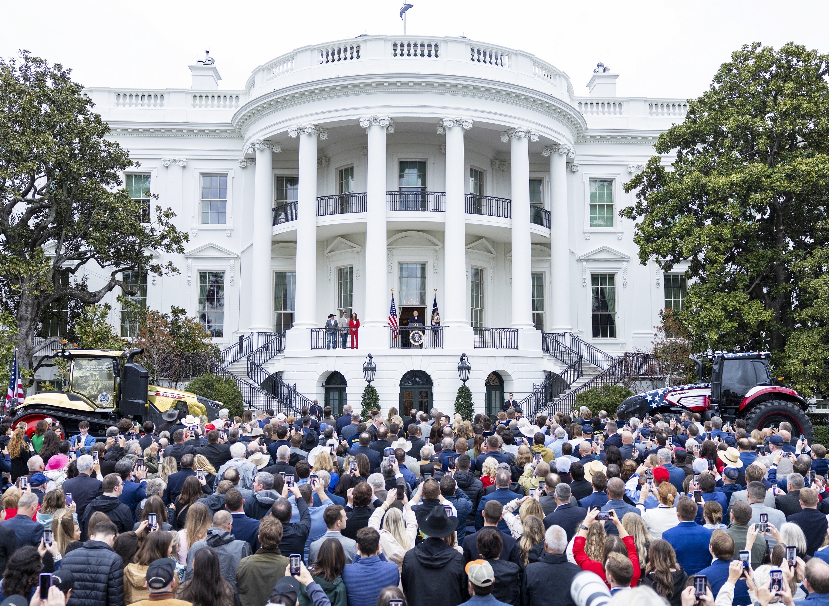 美国总统 Donald Trump 在白宫南草坪向美国农民代表发表演讲,华盛顿特区。3月27日,美国白宫农业主题活动共邀请超过800名美国农民、农场主及企业代表参加,美国总统 Trump 在演讲中宣称他执政一年以来共向美国农民提供120亿美元补贴、让农业收入上升20%,并宣称中国将从美国采购价值400亿美元、总量达4000万吨的大豆。中国海关总署公布数据显示,2026年1至2月中国从美国进口大豆量为149万吨,同比下降-83.7%。摄影师:Shawn Thew