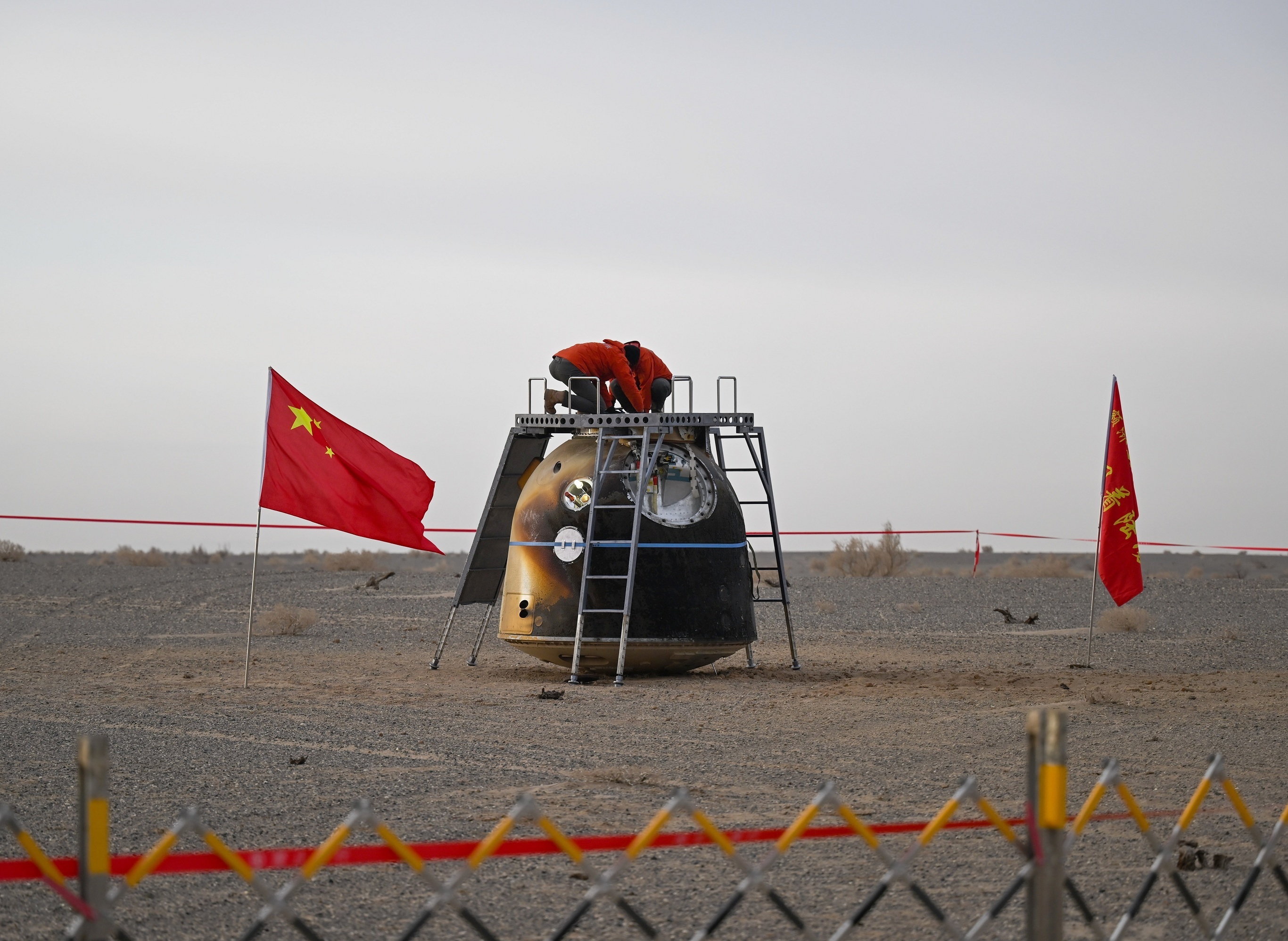 「神舟二十号」载人飞船返回舱在内蒙古东风着陆场着陆。1月19日,「神舟二十号」飞船以无人状态撤离中国天宫空间站并顺利返回地球,地面人员在现场检查确认返回舱外观总体正常,舱内下行物品状态良好。「神舟二十号」飞船于2025年4月24日发射升空,11月初发现舷窗因空间碎片撞击而出现裂痕,返回前已提前安装加固装置。该飞船成功返回标志着中国空间站首次太空应急行动的主要任务已全部完成。摄影师:Li Zhipeng